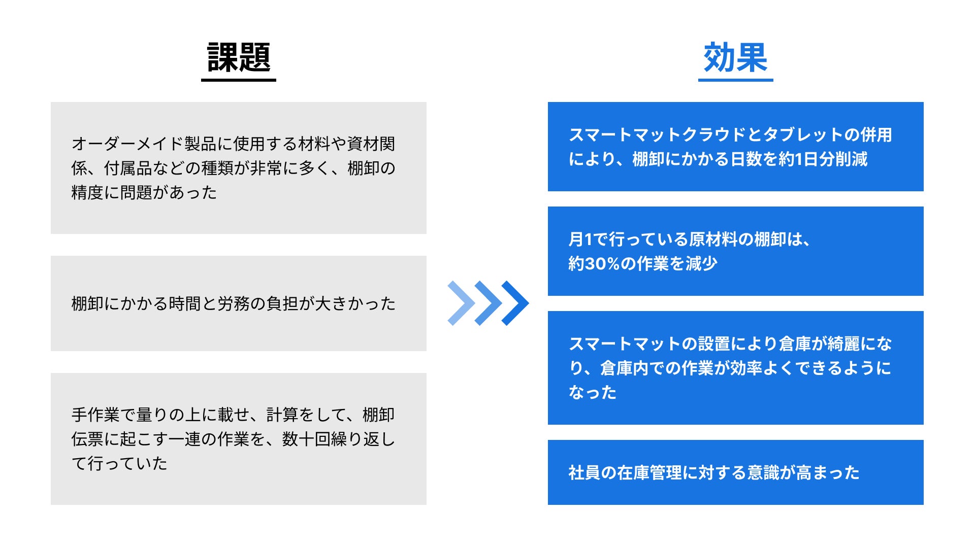 スマートマットクラウドを導入することで、棚卸作業を即座に完了させることができ、棚卸工数の削減と労務負担の軽減が期待されました。また、棚卸による製造作業への影響も軽減できると考え、導入に至りました。