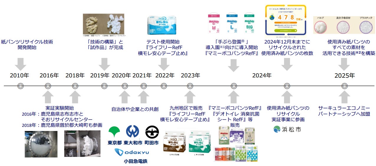 今回の受賞は、当社が推進する使用済み紙パンツ(紙おむつ)の水平リサイクル「RefF(リーフ)」が高く評価されたことによるものです。「RefF(リーフ)」は、世界で初めて使用済み紙パンツを資源として再生利用することを実用化したプロジェクトであり、従来は廃棄処理しか選択肢のなかった製品に新たな循環の道を拓いた点が特に評価されました。また、世界初の最先端のオゾン処理技術による安全性・衛生性の確保に加え、鹿児島県志布志市および大崎町と協働して地域全体で資源循環の仕組みを構築した点は、持続可能な社会の次世代モデルとして注目されました。再生された素材をベビー用品・介護用品・ペット用品といった多様な商品領域に展開し、循環型社会の実現を生活者視点で具体化していることも、受賞の決め手となりました。