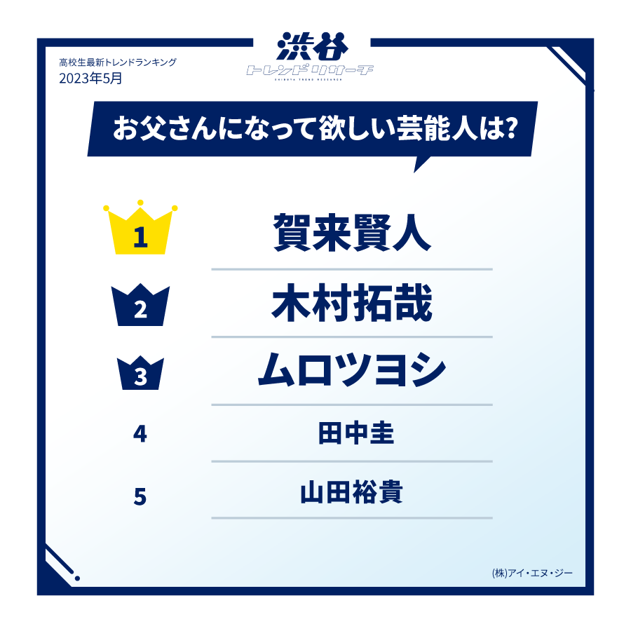 2016年に榮倉奈々さんとの結婚を発表し、現在は2児の父親でもある「賀来賢人」さんが1位を獲得しました。「一緒にいて絶対に楽しい」「自慢したい」「自分の友達とも良い関係を築いてくれそう」といったコメントが寄せられ、高校生たちが父親に求める理想像が垣間見えます。そして、2位と3位には、「木村拓哉」さんと「ムロツヨシ」さんが今年もランクイン。プライベートでの父親としての存在だけでなく、映画やドラマで父親役を演じた経験も注目されるポイントのようでした。