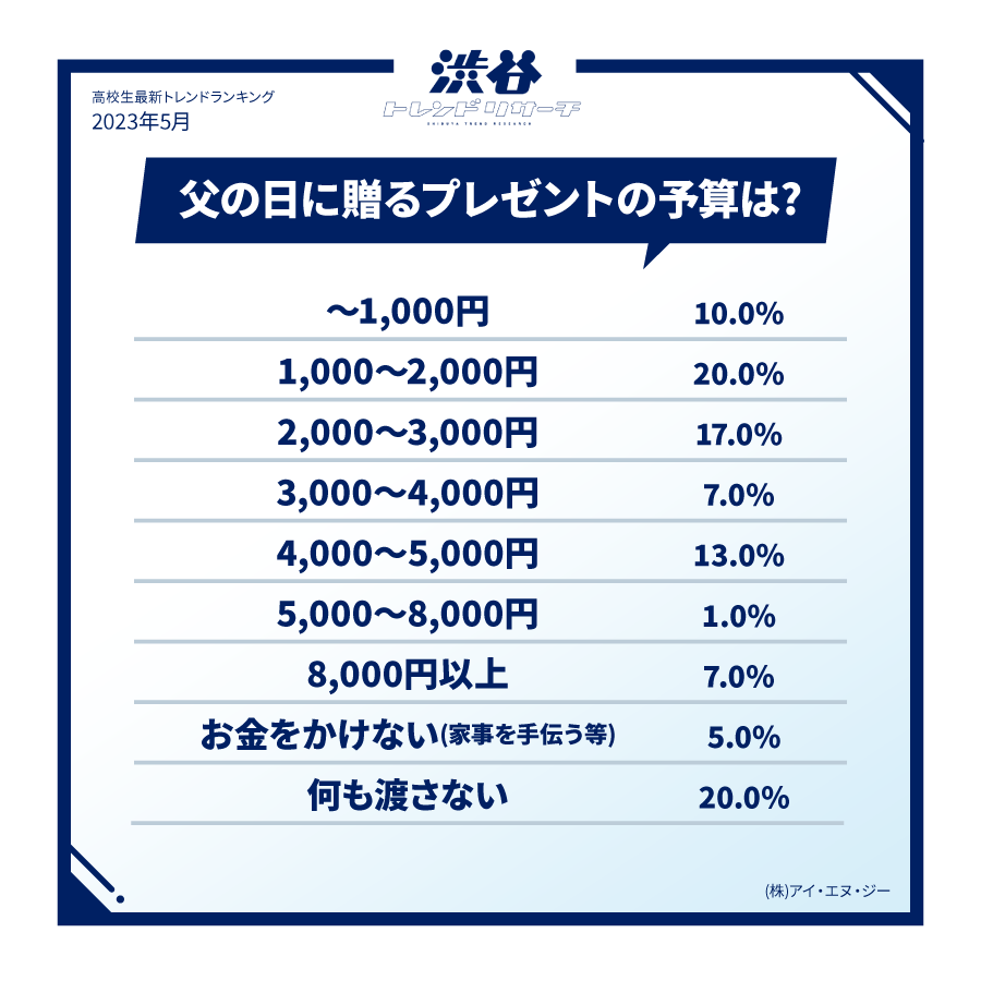 最も多く選ばれた金額帯は「1,000〜2,000円」でした。ハンカチやボールペン、靴下などを購入予定としているようで、実用性を基準にプレゼントを選ぶ傾向が窺えました。また、同率の「何も渡さない」を選んだ高校生からは「何を贈れば良いのか分からない」といったコメントが散見され、母の日のように定番のプレゼントが存在しないことが影響しているようです。