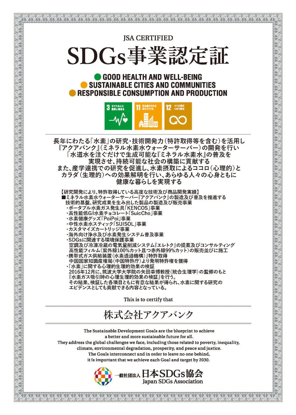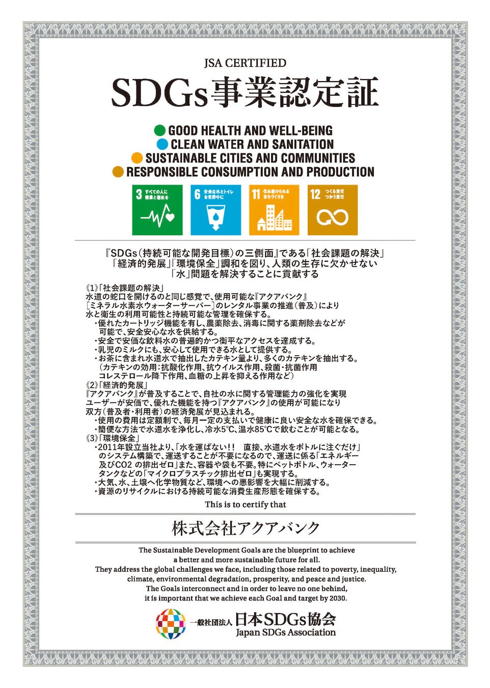 ヘルスケア事業を展開する株式会社アクアバンク(本社:大阪府大阪市中央区、代表取締役社長:竹原タカシ、以下「アクアバンク」)は、企業活動およびウォーターサーバー事業の2部門において、一般社団法人 日本SDGs協会による『SDGs事業認定』を受けましたこと、お知らせいたします。