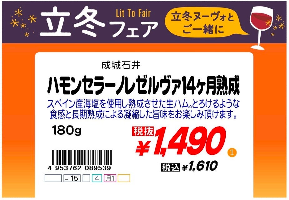 また、スイスのミフロマ社が手掛ける洞窟熟成チーズやフランスのマルセルプティット社の低温熟成チーズなど、こだわりのナチュラルチーズもホールやブロックで自社輸入し、自社工場でカット・包装することでコストを抑え、お求めになりやすい価格を実現。店頭では、「立冬ヌーヴォ」と合わせて楽しんでいただきたいフェア対象商品に「立冬ヌーヴォとご一緒に」のPOPを付けてマリアージュのご提案をいたします。ワインとともに、冬の訪れを感じながら心温まる食卓をお楽しみください。