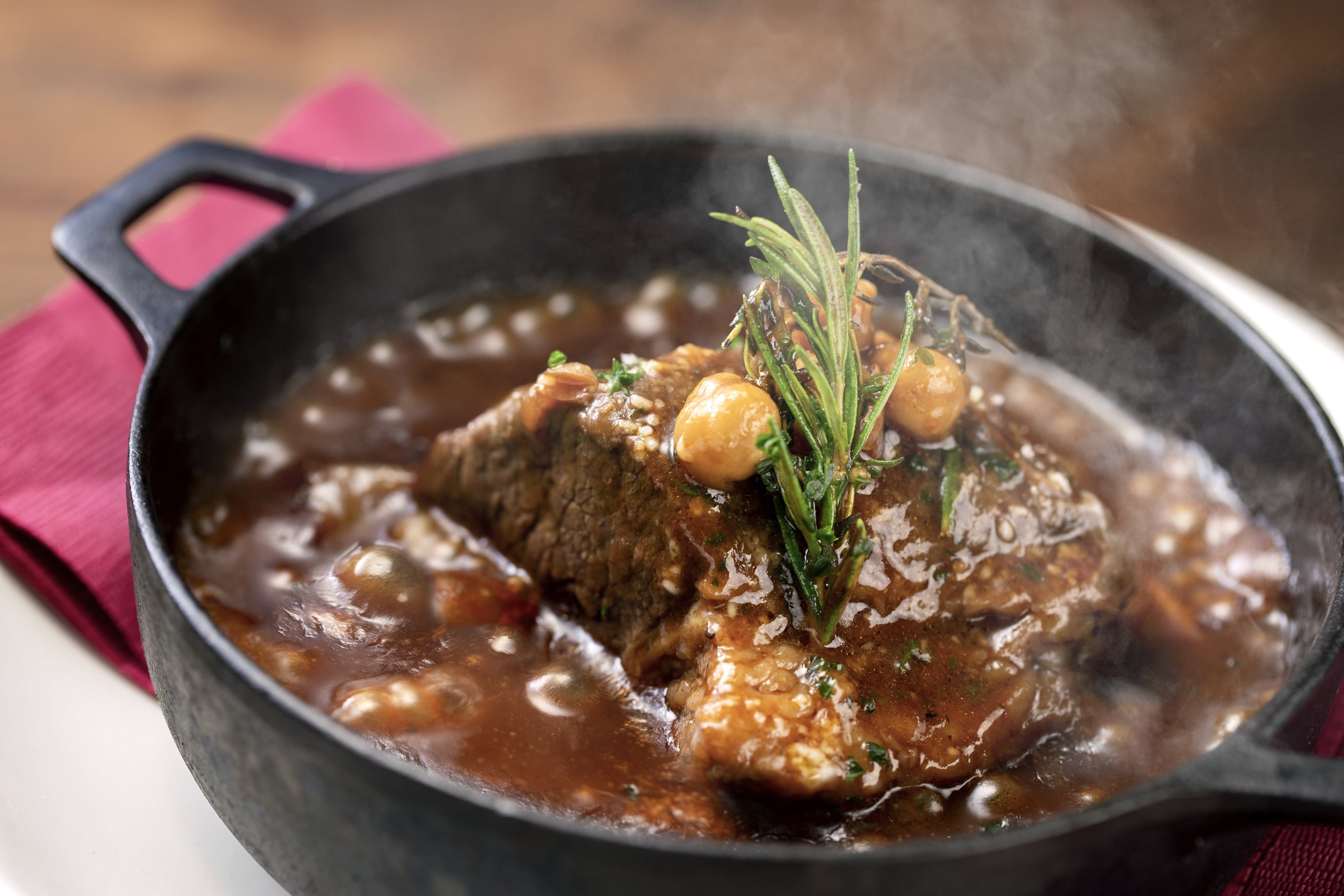 5時間加熱しホロっと柔らかく仕上げた黒毛和牛を、赤ワインとパルミジャーノ・レジャーノ、ひよこ豆、ハーブを加えたデミグラスソースで煮込んだ温かい1皿です。程よい熟成感のある「立冬ヌーヴォ」の味わいとよく合います。