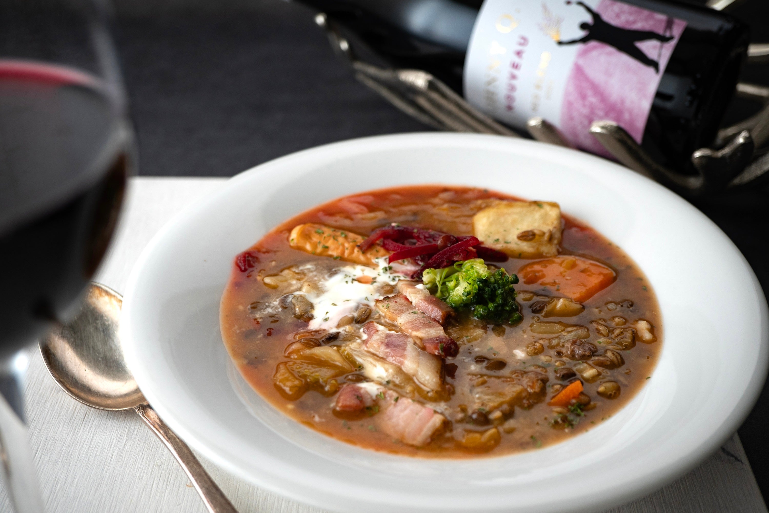 フォンドボーやデミグラスソースを使用し、じっくりと4時間煮込んだ牛すね肉の旨味あふれるスープは、「立冬ヌーヴォ」の程よい熟成感と良く合います。