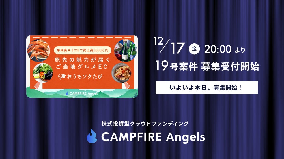 株式投資型クラウドファンディング「CAMPFIRE Angels」、本日12月17日(金)20:00より第19号案件募集開始
