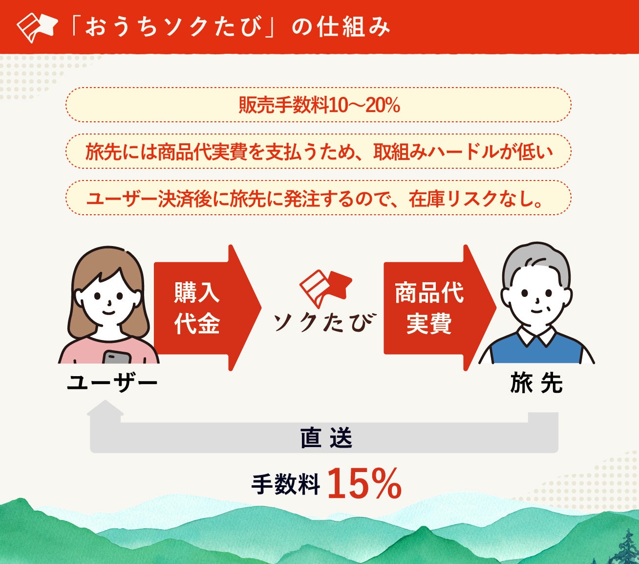 「おうちソクたび」は販売手数料として販売価格の10〜20%をいただき、在庫はユーザー決済後に旅先に発注。在庫を持たずに運営するビジネスモデルです。仕入れ先である旅先には商品代実費を支払う仕組みで、出品には手数料がかかりません。