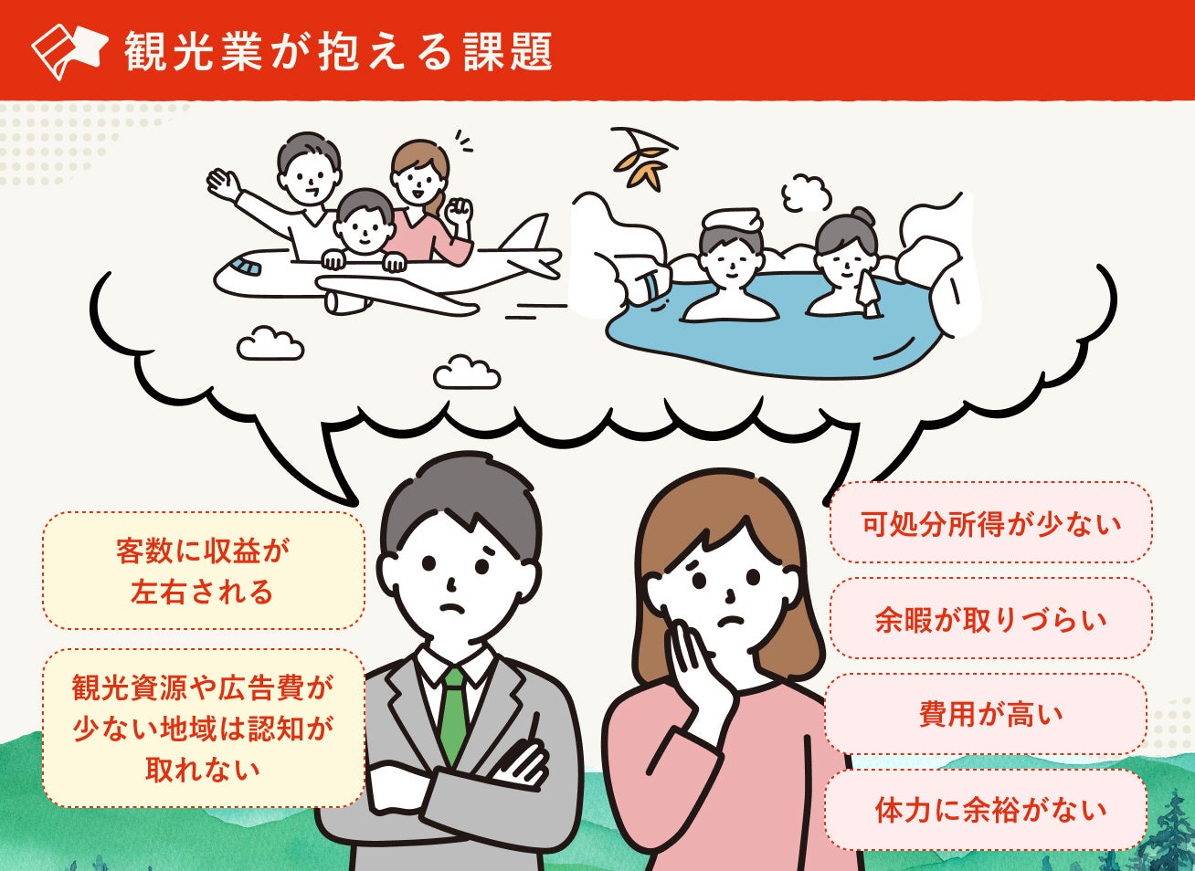 旅行に出るまでには、可処分所得の有無に加え、余暇時間の取りづらさや旅行予算の高騰、体力に余裕がないなど、様々な障壁があります。また、コロナウィルスのような感染力の高い疫病が流行った場合、旅行へのハードルはさらに高まっています。また、旅行先を決める際の選択肢の少なさも課題として挙げられます。旅行代理店のウェブサイトや街中で見かけるのはすでに有名な地域ばかり。新しい旅先を見つけるためには、これまでとは違った情報の取得方法が必要です。