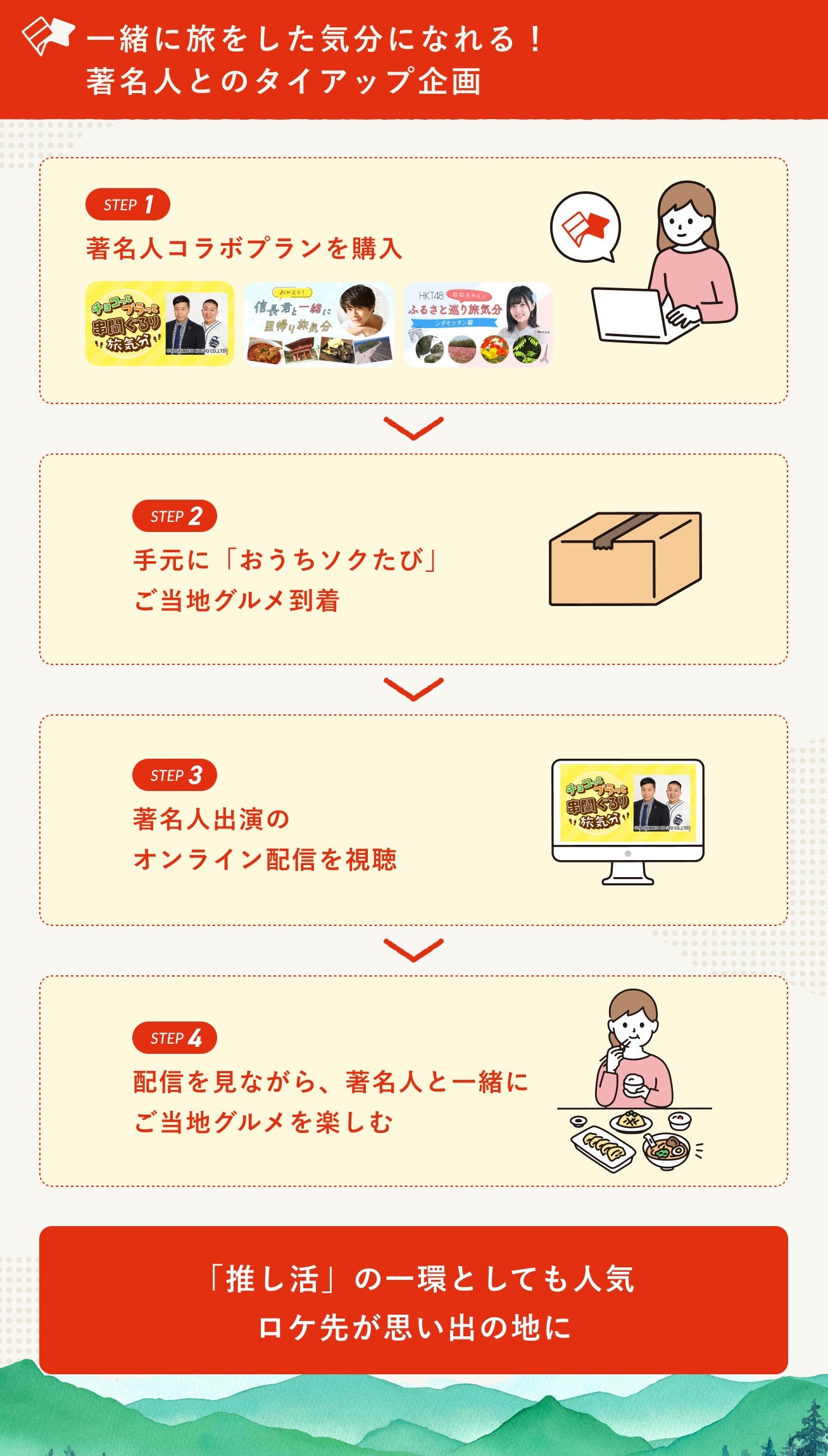 そこでOrange株式会社が提供するのが、旅気分が味わえるご当地グルメを全国の食卓に届ける「おうちソクたび」。国内だけでも1,000以上あると言われているご当地グルメをピックアップしています。これにより観光地は来客数に左右されずに収益が確保でき、消費者側はいつもの食卓に変化をつけながら旅気分を味わえます。現地に行かない、新しい旅の形です。