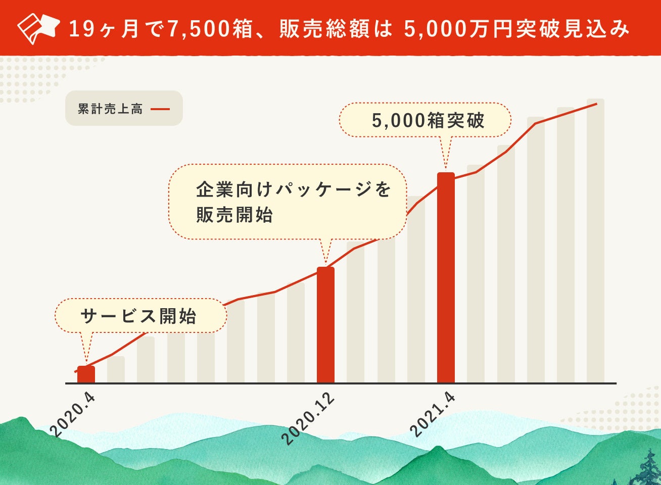 リリース後順調にご注文を頂いており、19ヶ月で7,500箱以上をお届け。販売総額は5,000万円を突破する見込みです(2021/12月初旬現在)。ユーザー数が増えるほど仕入れ値の取引がしやすくなるため、サービスの成長とともに粗利率が上がり提供価格も抑えられます。