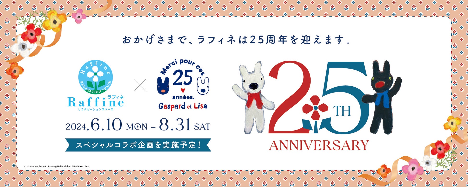 子供から大人まで、世界中で幅広い世代から人気を集めるリサとガスパール。同じく日本や海外(オーストラリア)で幅広い年世代のお客様にご愛顧いただいている「リラクゼーションスペース ラフィネ」は、2024年に時を同じくして25周年を迎えます。これを記念し、多くのお客様にご利用いただいたことへの感謝を込めて「リサとガスパールコラボキャンペーン」を実施いたします。