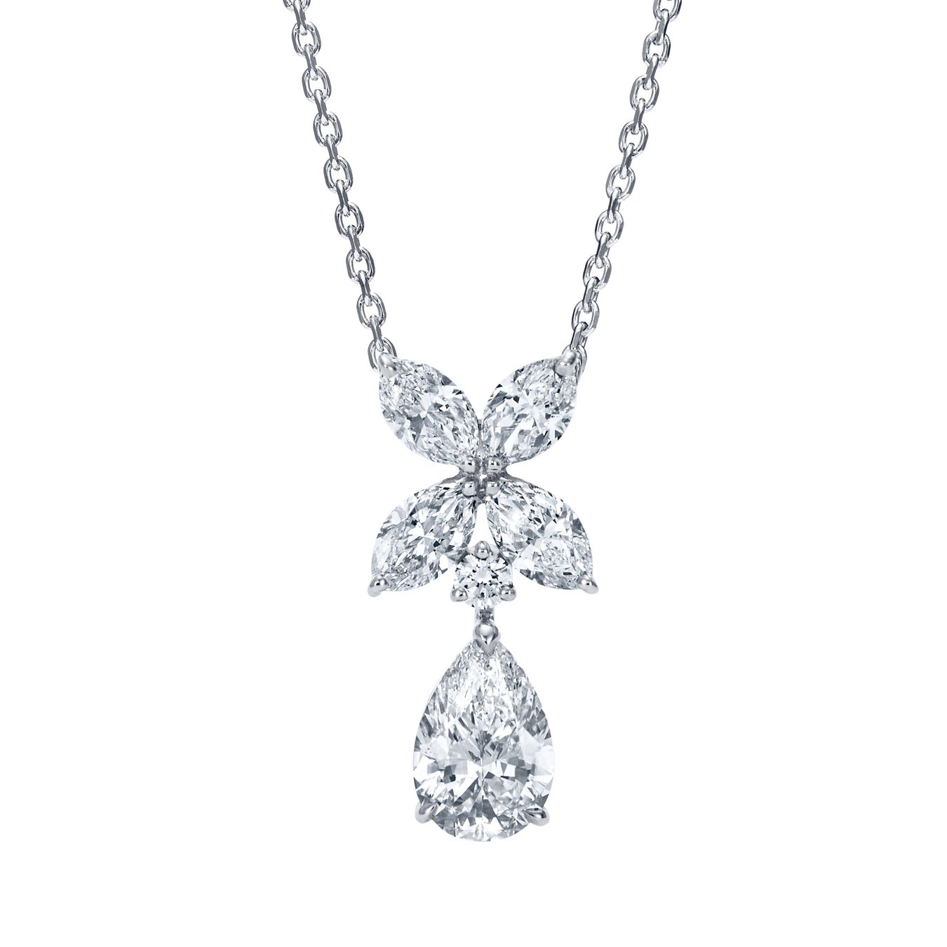 併せて発表されるペンダントは、メインに飾られた「ロイヤル・アッシャー・ペアシェイプカット」が、葉や花を連想させる4石のマーキースカットのダイヤモンドとともに、洗練された美しさを放ちます。このペンダントシリーズは、国際パテントを取得している他4種のダイヤモンドカットのデザインに新たにペアシェイプカットが加わり、全5型の展開となります。