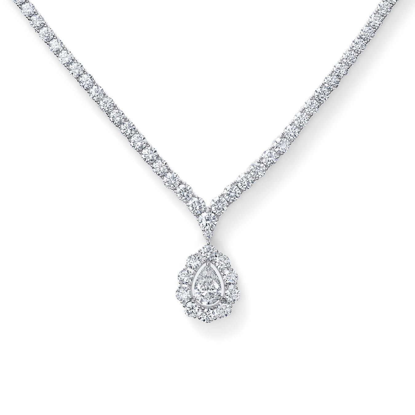 新作ネックレスは、葉の先端から零れ落ちる雫から着想し、胸元に落ちる一粒の雫のイメージを華やかなきらめきと繊細なフォルムで表現しました。ネックレス部分は、メレダイヤモンドがトップに向かって緩やかに大きくなるグラデーションで配置されており、トップにあしらわれた「ロイヤル・アッシャー・ペアシェイプカット」へと繊細につながるデザインです。首元から胸元に添う柔らかなラインが、上質な美しさをさらに引き立てます。