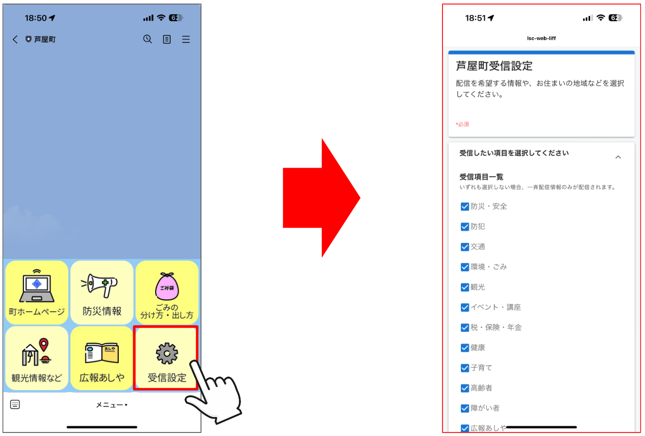 今回のリニューアルでは新たに「受信設定」を設置。住民はこれに回答することで、配信を希望する情報カテゴリーをカスタマイズすることができます。