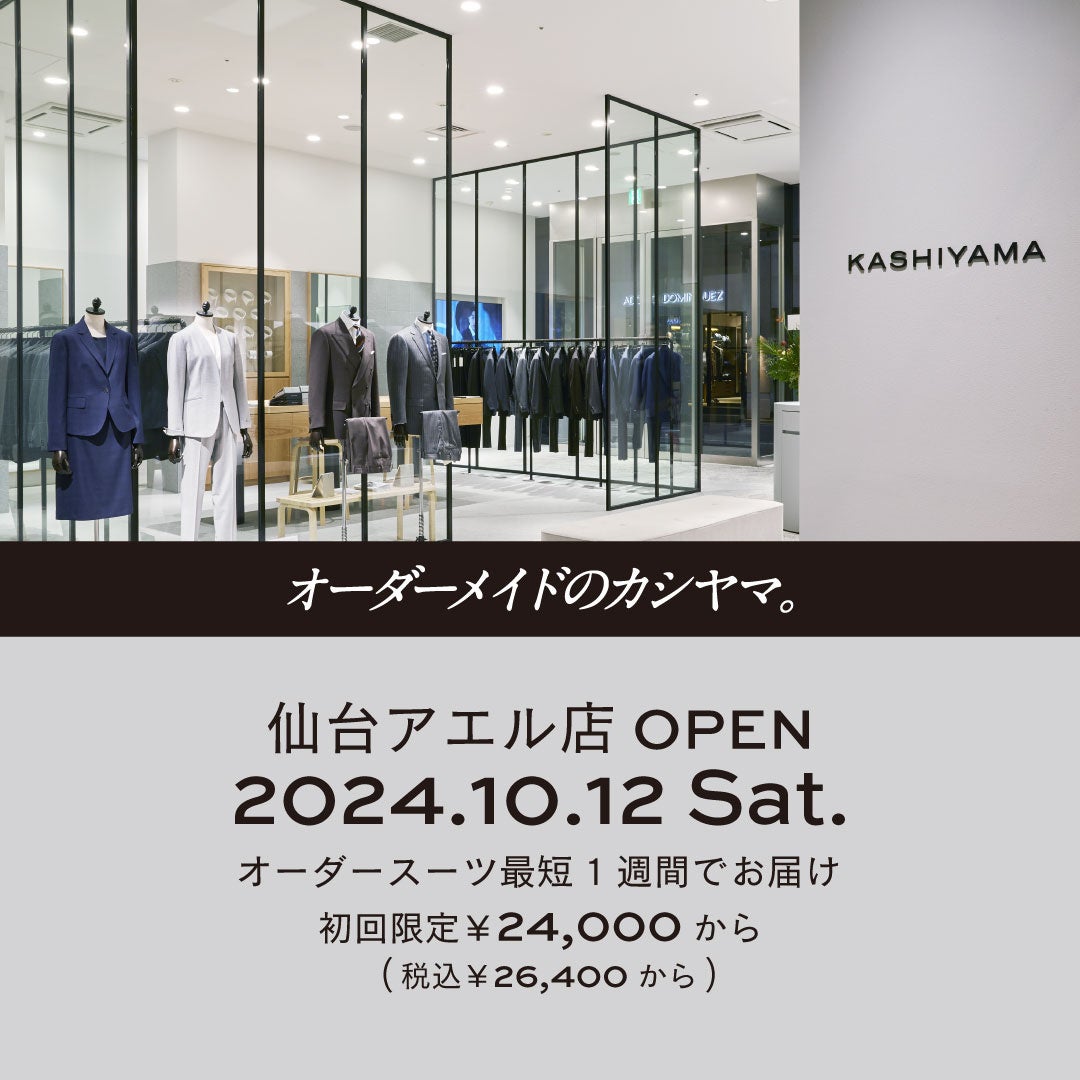 株式会社オンワードパーソナルスタイル(本社:東京都港区 代表取締役社長:関口 猛)は、オーダーメイドの『KASHIYAMA』(https://kashiyama1927.jp/)において、仙台エリア2店舗目となる「KASHIYAMA 仙台アエル店」を10月12日(土)にオープンいたします。