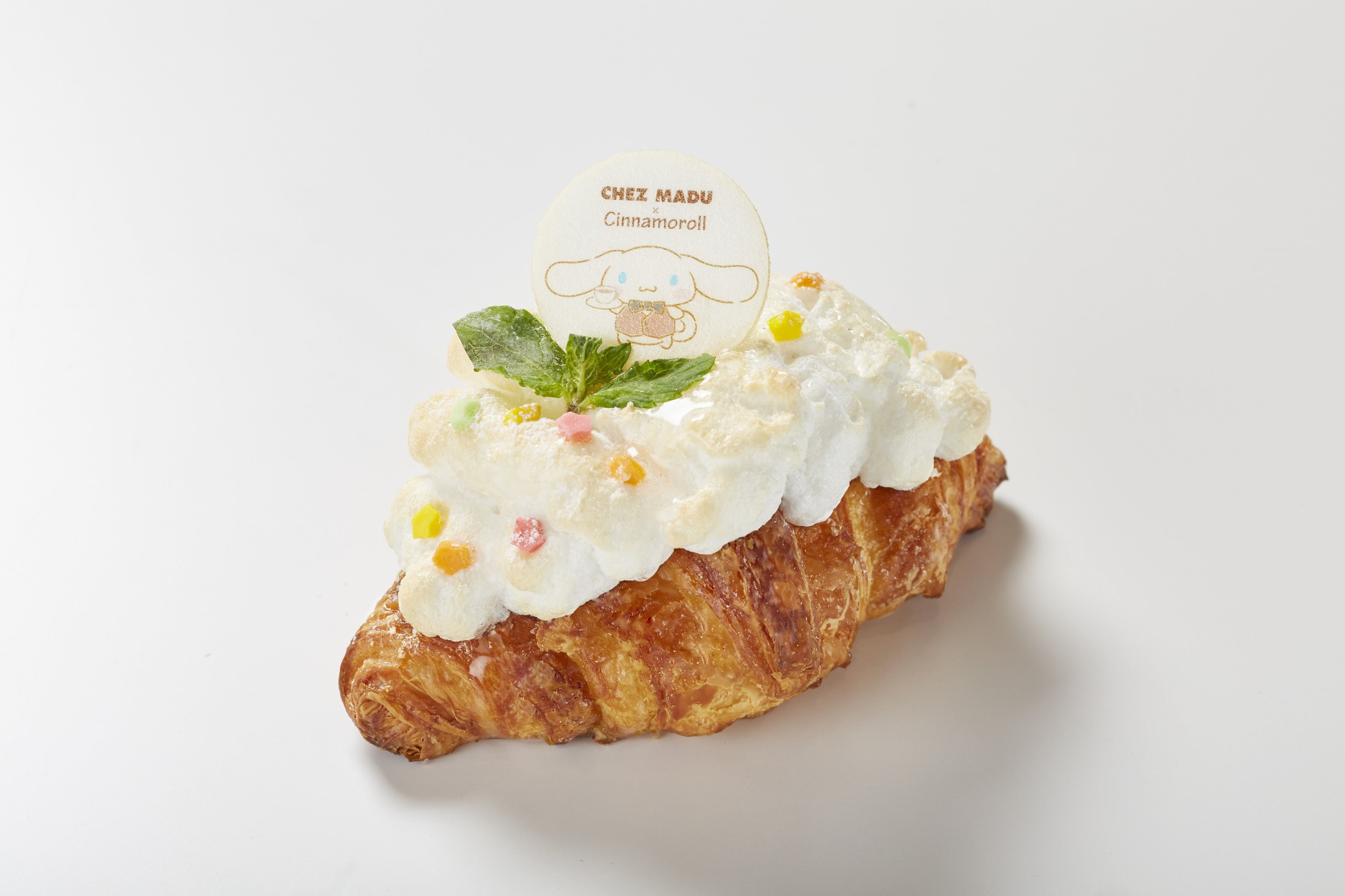 クロワッサンにマンゴー風味のメレンゲをのせて焼き上げ、雲をイメージした"くもワッサン"。