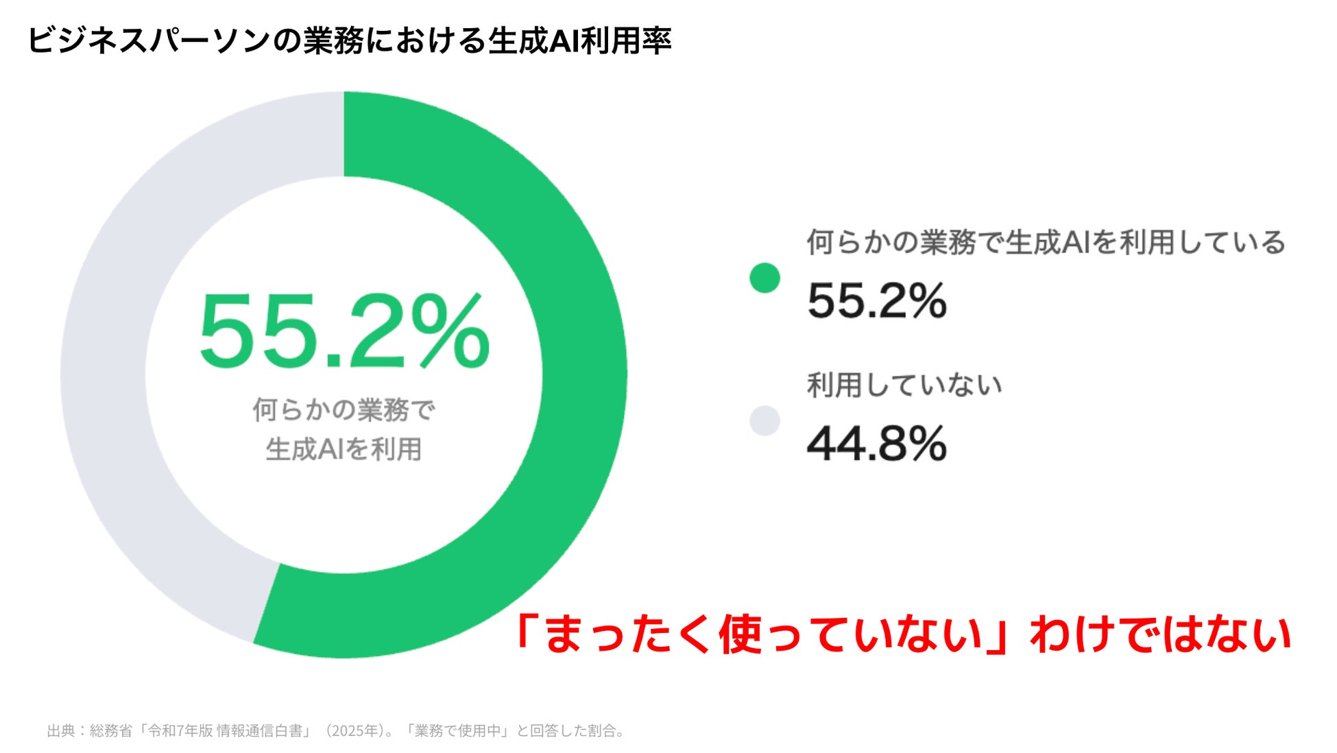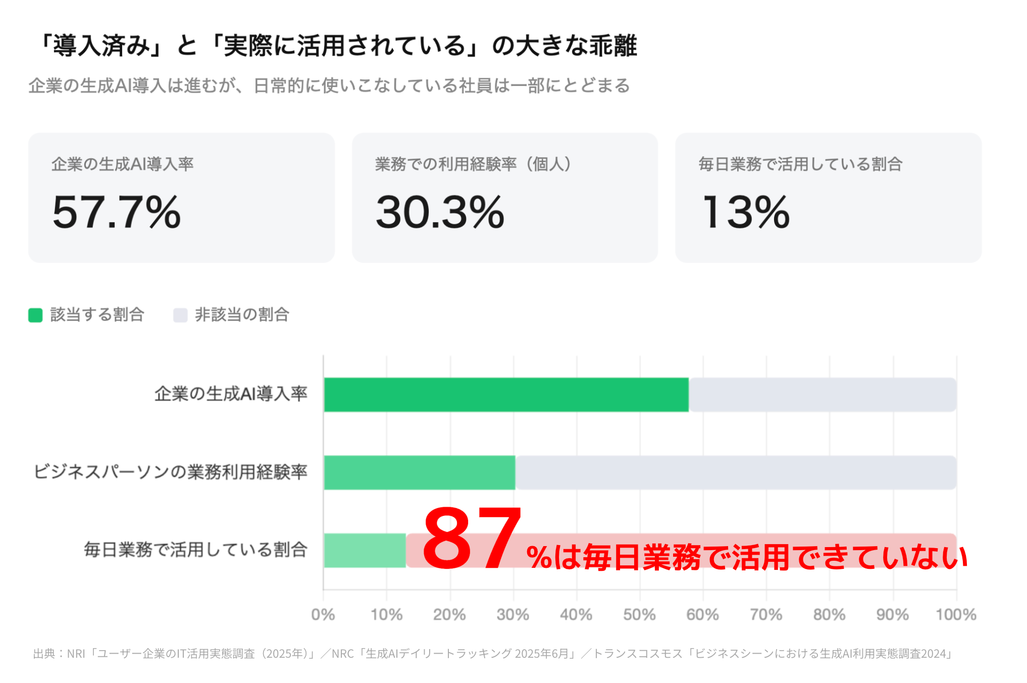 多くの企業が生成AIのアカウントを導入したものの、実際に日常業務で活用しているのは一部の社員だけ——という状況に直面しています。