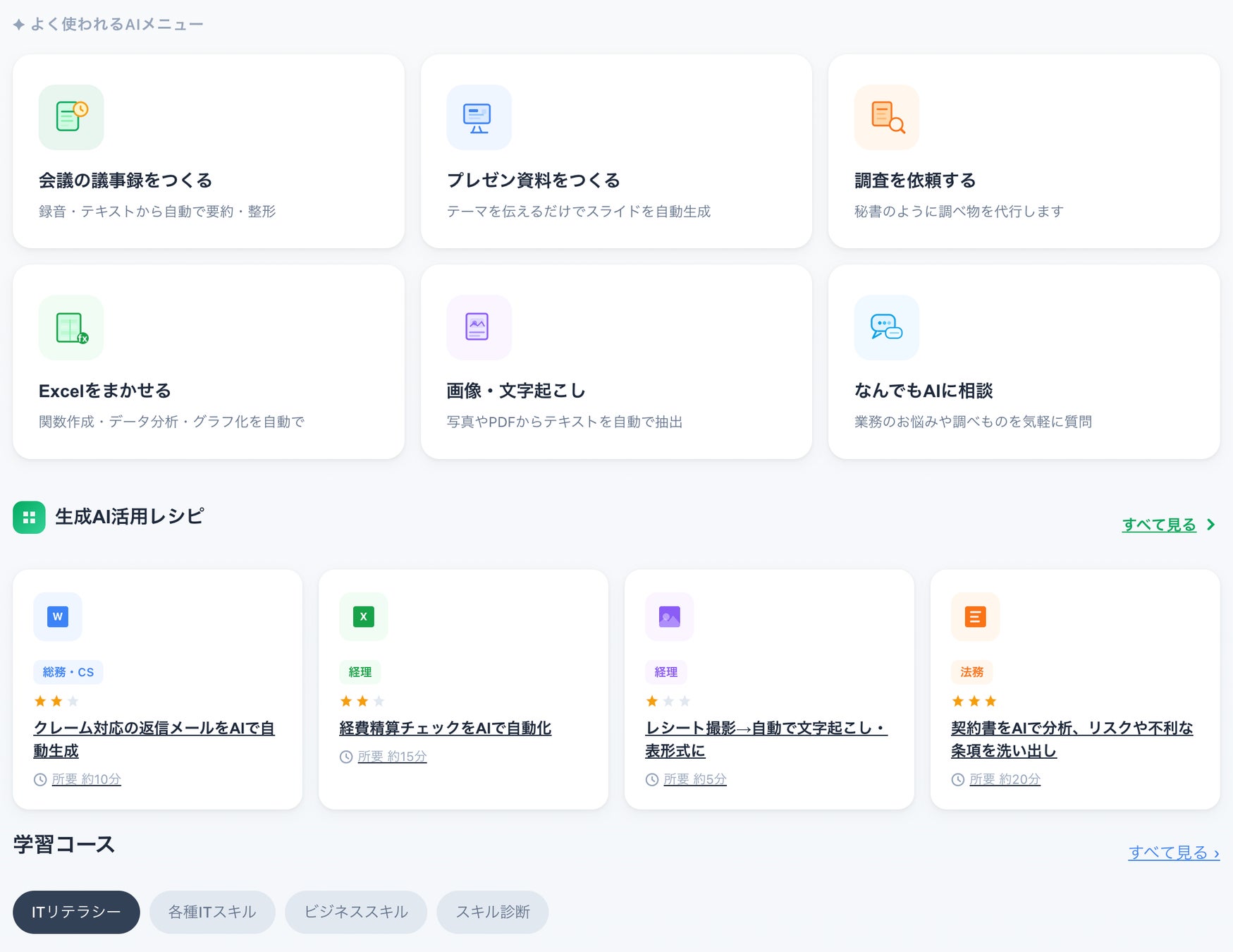 「スキルを学ぶ → AIツールを使う → 業務で定着させる」という一連の流れを、ワンストップで実現できます。