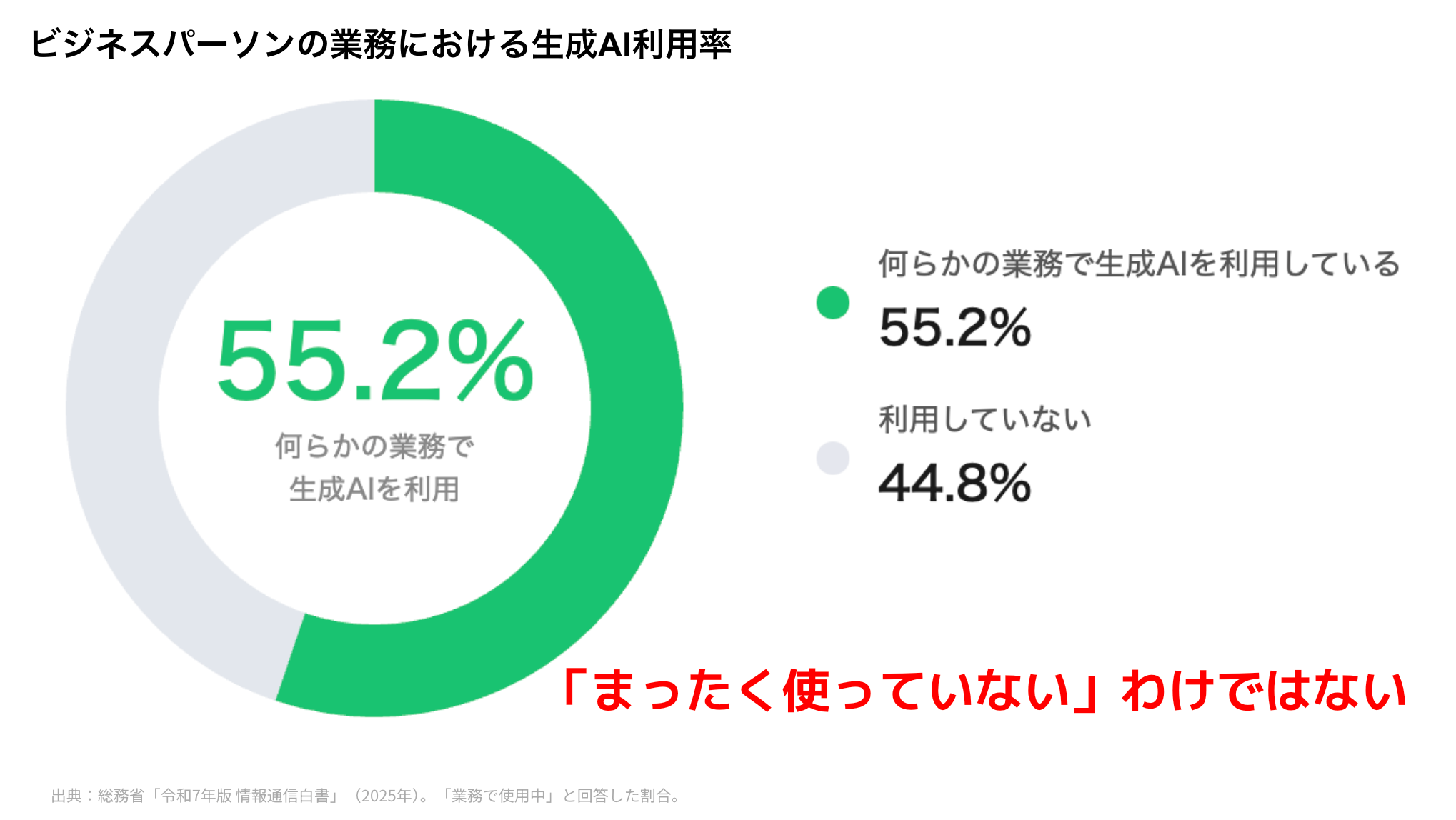 企業の生成AI導入は進むが、日常的に使いこなしている社員は一部にとどまっていることが以下のグラフからも見て取れます。
