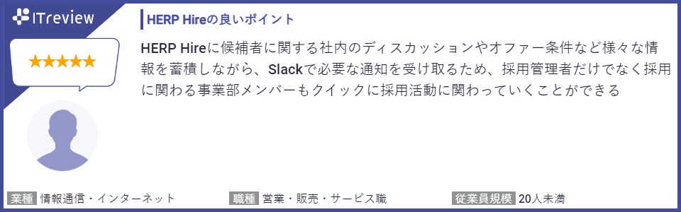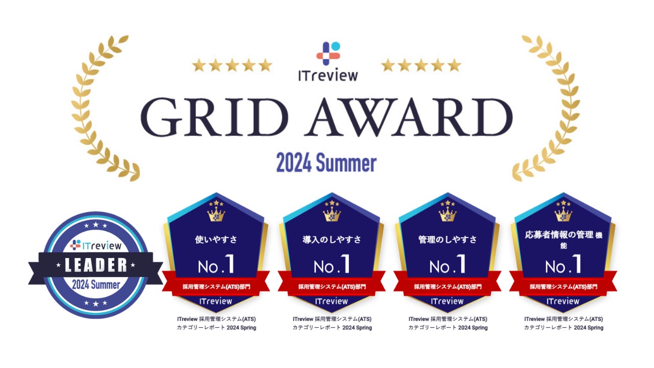この度『HERP Hire』は「ITreview Grid Award 2024 Summer」の採用管理システム(ATS)部門において「Leader」を受賞しました。また同部門では、「使いやすさ」「導入のしやすさ」「管理のしやすさ」「応募者情報の管理機能」でNo.1を獲得しています。