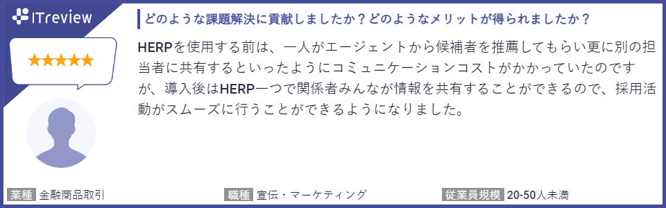 事業内容:採用管理システム『HERP Hire』の開発・提供、タレントプールシステム『HERP Nurture』の開発・提供、採用コンサルティング事業の提供、人材紹介会社向け求人管理システム『ジョブミル』β版の開発・提供、スタートアップ・ベンチャーの最新求人情報を提供する求人媒体『HERP Careers』β版の開発・提供、オンライン完結型リファレンスチェックツール『HERP Trust』の開発・提供