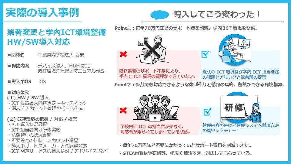 専門人材不足やICT活用に関する課題を抱える私立学校に対し、ICT支援員による柔軟なサポートを提供し、先生の業務負担軽減とICT活用の定着を支援