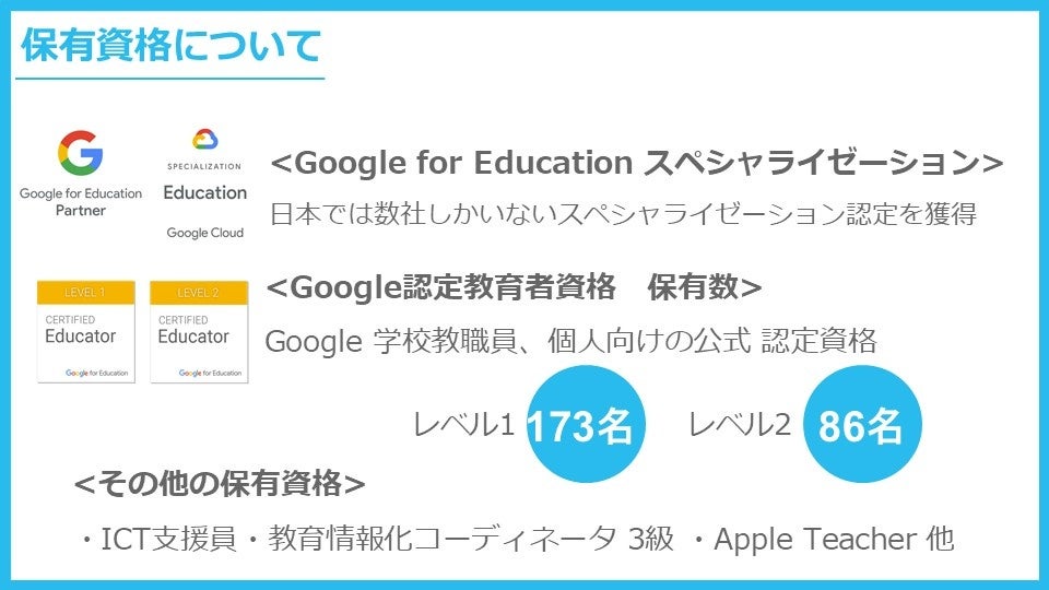 エージェントは、全国の公立学校向けにICT支援員事業やGIGAスクール運営支援センター事業を展開し、学校のICT環境整備・活用を支援してきました。これらの実績が評価され、Google for Education スペシャライゼーションパートナーおよび文部科学省「学校DX戦略アドバイザー事業」サポート事業者として認定されています。