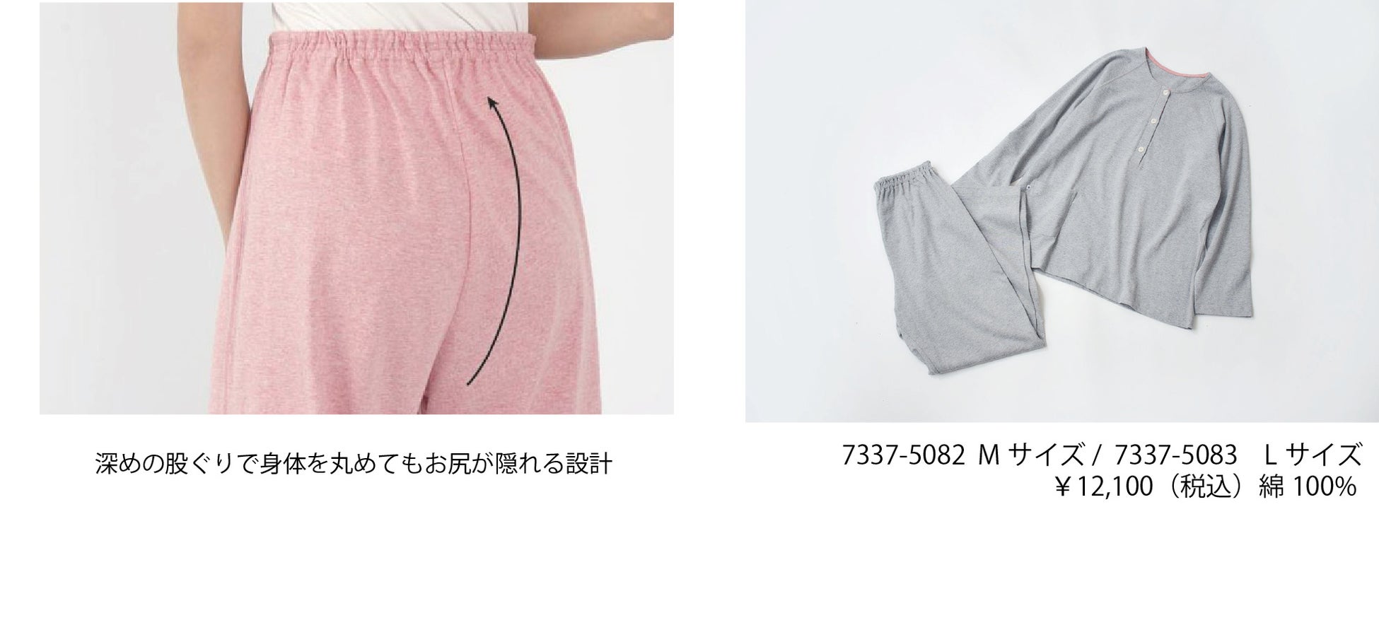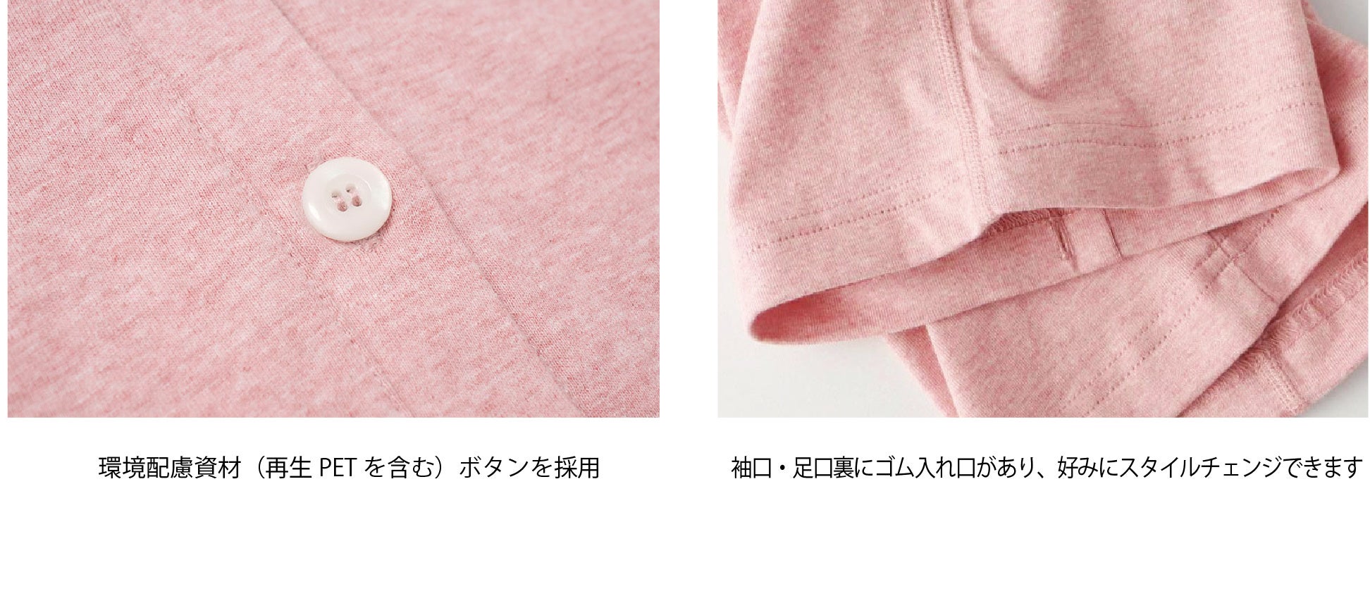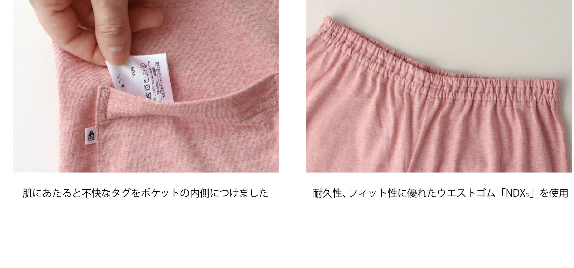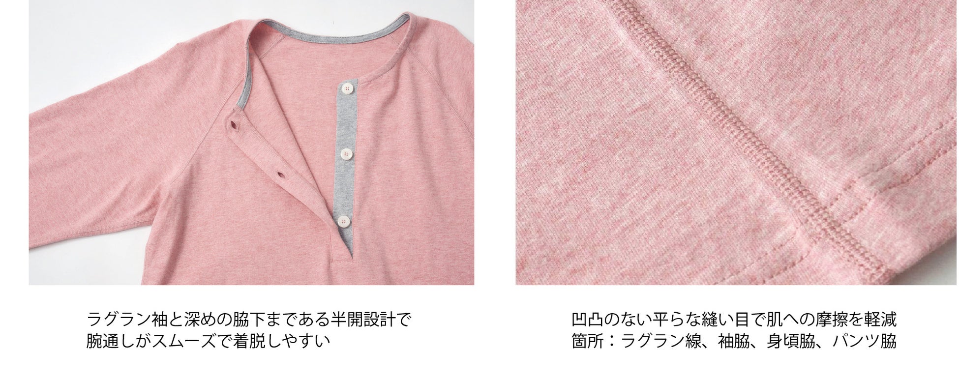 乾燥機対応の綿100%天竺素材を使用し、着脱時の腕通りがスムーズになるラグランスリーブ、深めの股ぐりで身体を丸めてもお尻が隠れる設計、肌との摩擦が軽減されるフラットシーマ縫製などを採用いたしました。