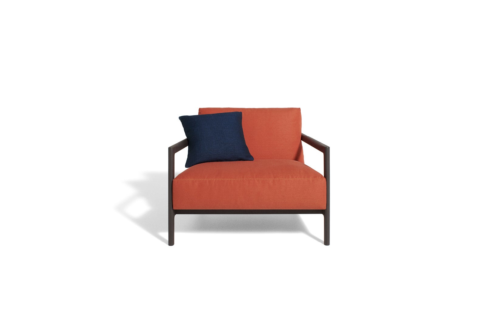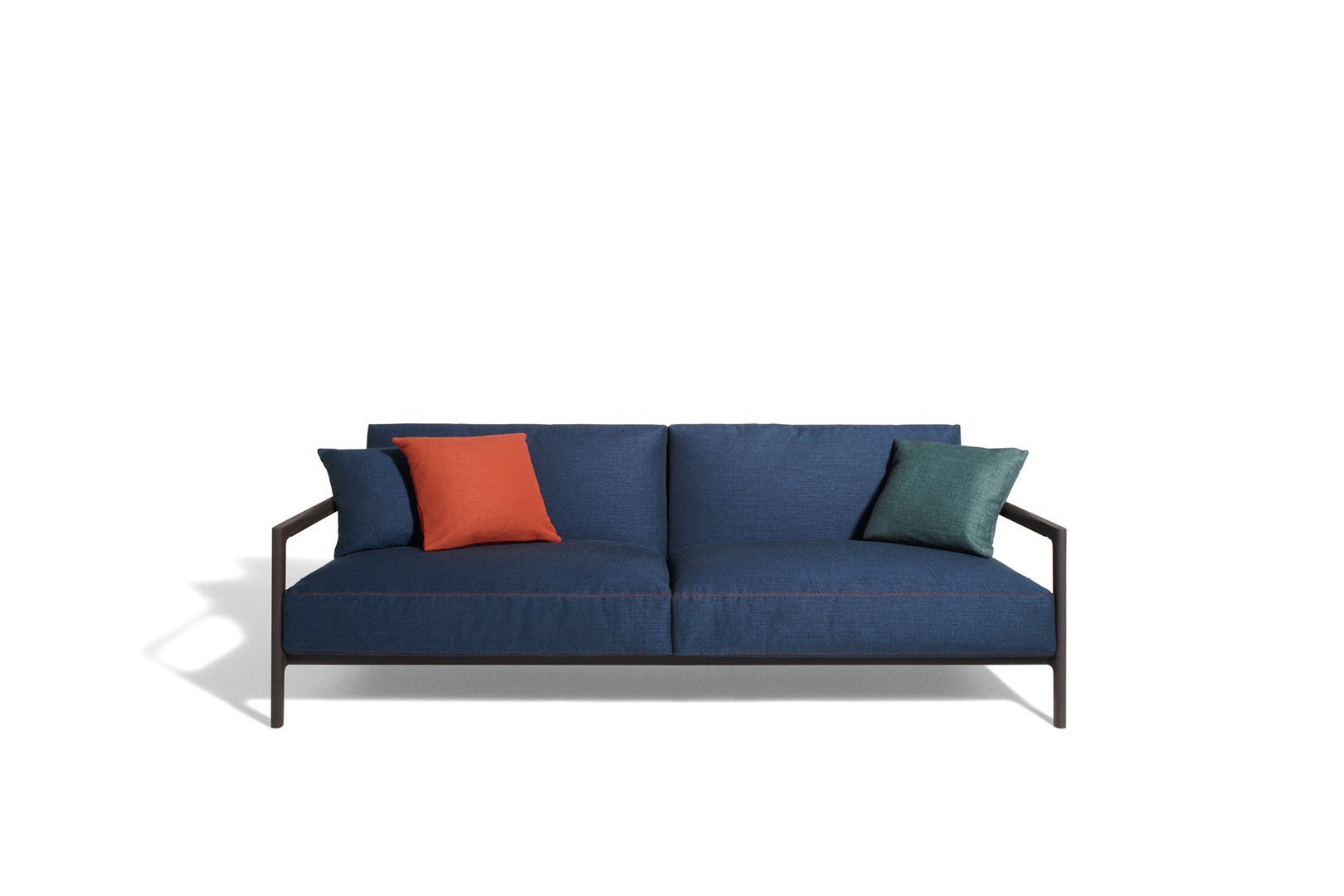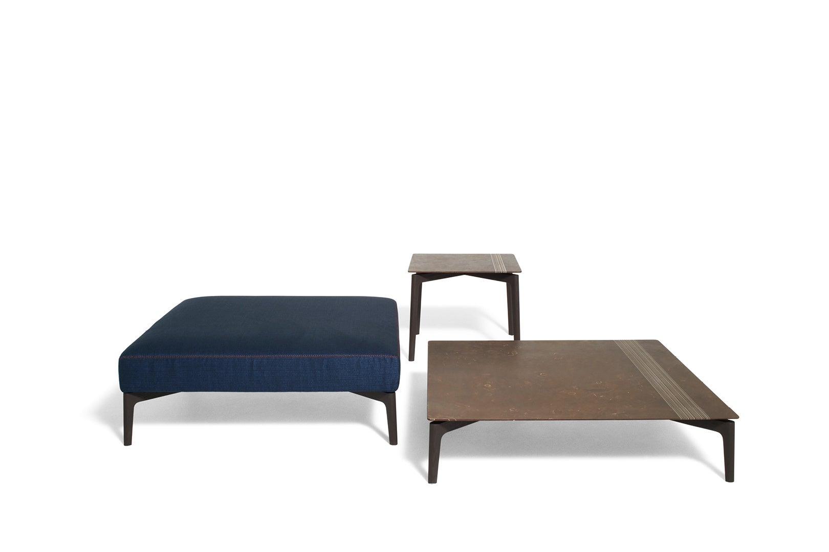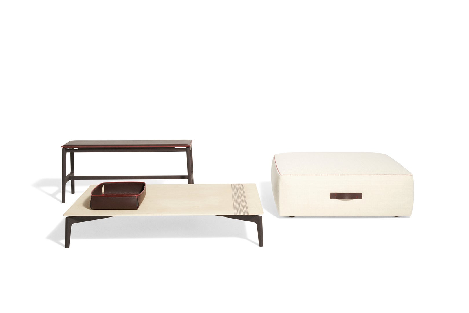 ポール・スミスを象徴するシグネチャーストライプは、伝統的なテーラリングのテクニックを思わせるジグザグ、クロス、プント・カヴァロ(ブランケットステッチ)などのカラーステッチで表現され、ほどよいアクセントを加えています。さらに、ソファの張地を固定するレザーストラップなどの色使いも、シグネチャーストライプを想起させます。一方で、ポールが愛する意外性の要素は、木や石といった異なる性質の素材を対比させることで表現されています。