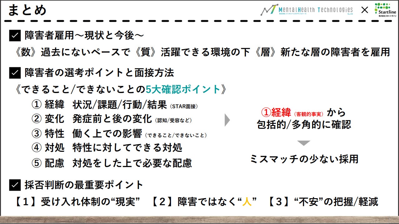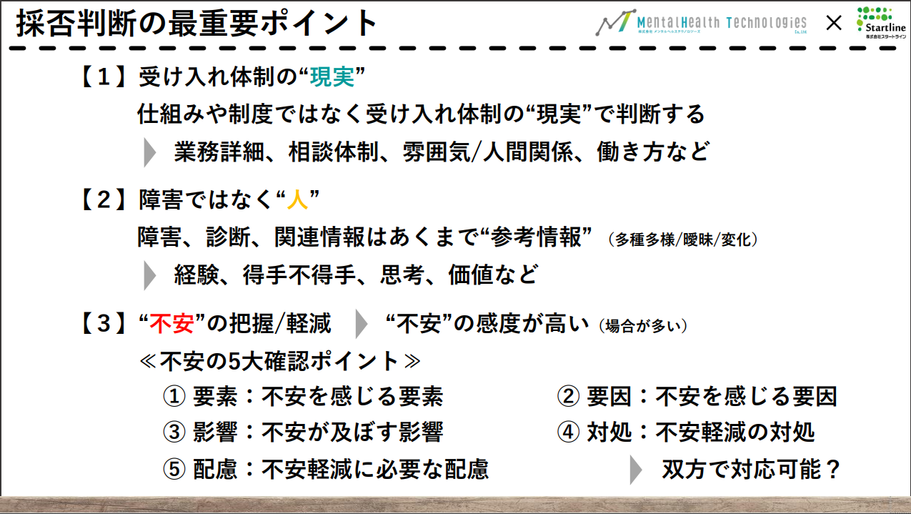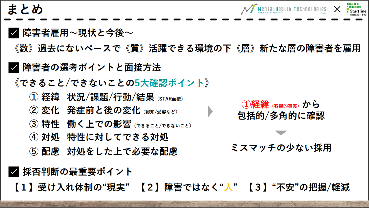 当社は「①障害者雇用の現状と今後」「②障害者の選考ポイントと面接方法」「③採否判断の最重要ポイント」の3テーマで、発達障害者の採用ポイントについて、これまでの障害者雇用における知見と雇用現場のリアルな視点から解説しました。特に「障害」ではなく「人」に向き合うことの大切さを最重要メッセージとしてお伝えしました。