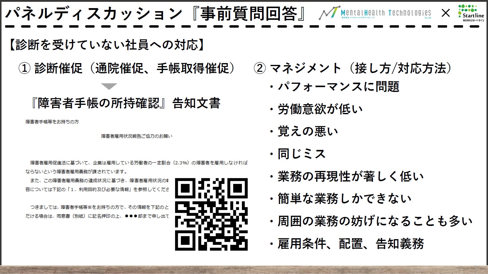 申込時にいただいた事前質問の約半数を占めていた「グレーゾーン」や「発達障害の疑いがある社員」に対する接し方や対応について、産業医と雇用現場の両方の視点を交えながら解説しました。
