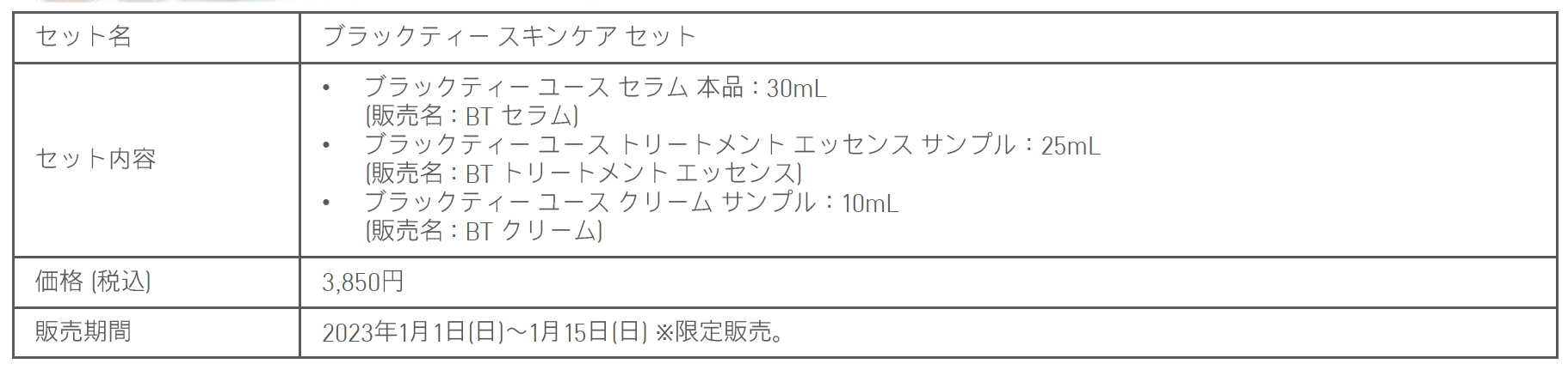 イキイキすこやか肌へと導く発酵茶葉由来“Rコンセントレート*3”を配合した「ブラックティー ユース セラム 」と「ブラックティー ユース クリーム 」、肌の乾燥を防ぎハリツヤを与える「Black Tea Peptide Activator™(ブラックティーペプチドアクティベーター™)」*4を採用した「ブラックティー ユース トリートメント エッセンス」の3製品をお試しいただけます。