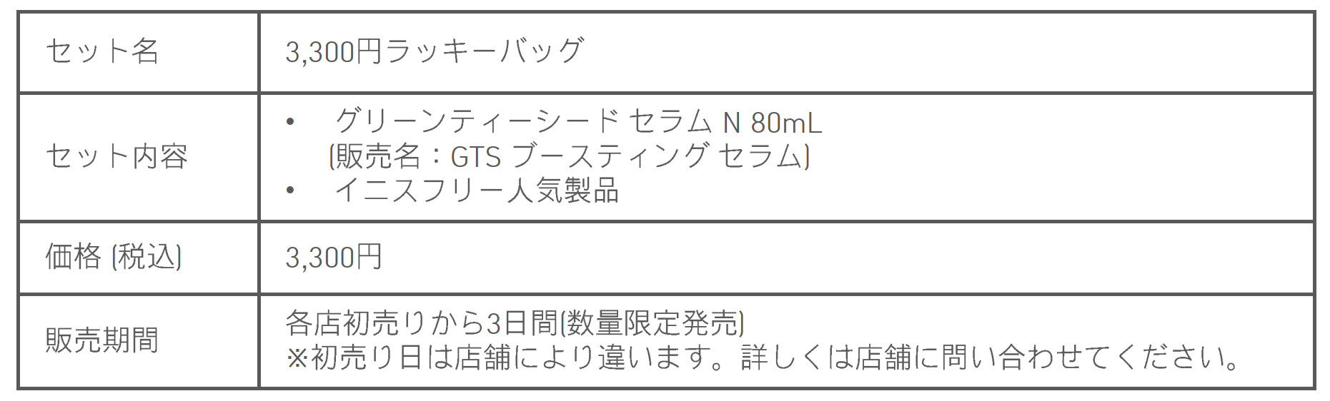 2023年の干支のうさぎは安全の象徴とされており、またその跳躍する姿から“飛躍”を表します。皆様と一緒に大きく飛躍・向上する年にしたいという想いを込めて、可愛らしいうさぎの限定パッケージアイテムが2つ登場しています。1つ目は「3,300円ラッキーバッグ」です。イニスフリーのロングベストセラーで、美容茶葉と緑茶乳酸菌*2の恵みがたっぷりの美容液「グリーンティーシード セラム N」にプラスして、イニスフリーの人気アイテムをランダムに詰め込んだお得な福袋です。イニスフリーの魅力がグッと詰まった、新年を迎えるにふさわしいラインナップとなっております。