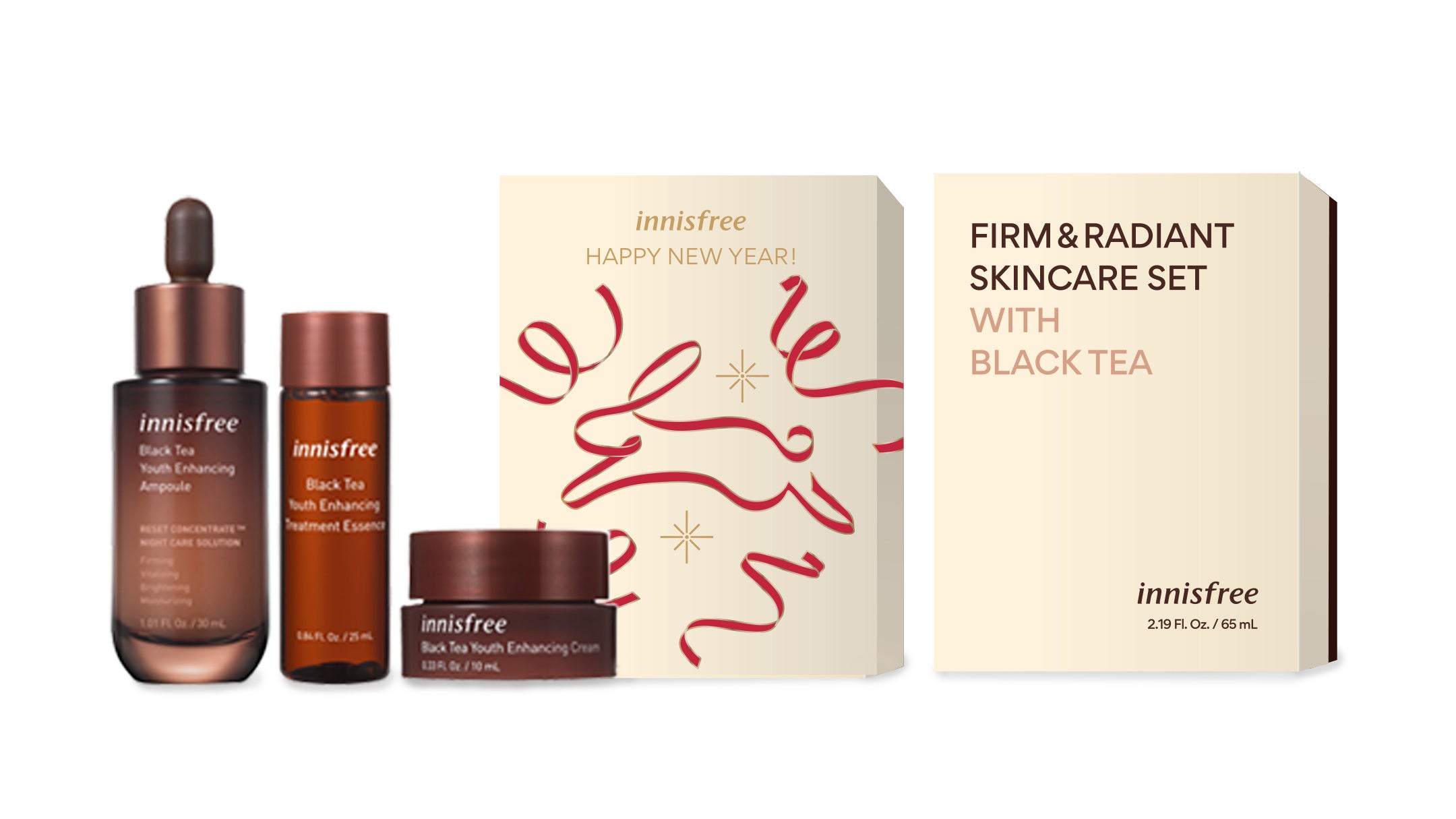 そして、2つ目は 「ブラックティー スキンケア セット」です。「ブラックティーライン」は茶の研究のプロであるイニスフリーが発酵茶葉の恵みを存分に注ぎ込んだ人気ラインの1つです。肌ストレス*3を受けがちな現代人のエイジングケア*4の悩みにアプローチするスキンケアラインとして誕生しました。その中から大注目の美容液2種とクリームがセットになっており、乾燥が気になる今の時期におすすめのセットとなっております。2023年1月1日(日)~1月15日(日)の期間中、「ブラックティー スキンケア セット」を1点ご購入ごとに、かっさを1個プレゼントする新年キャンペーンも実施いたします。
