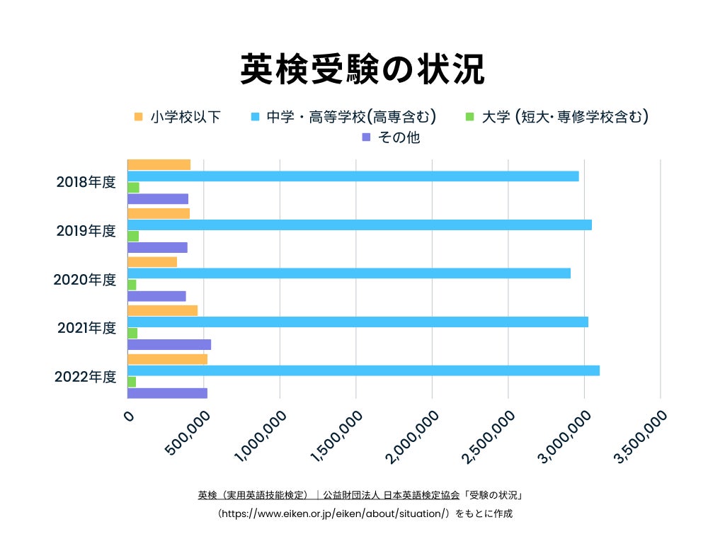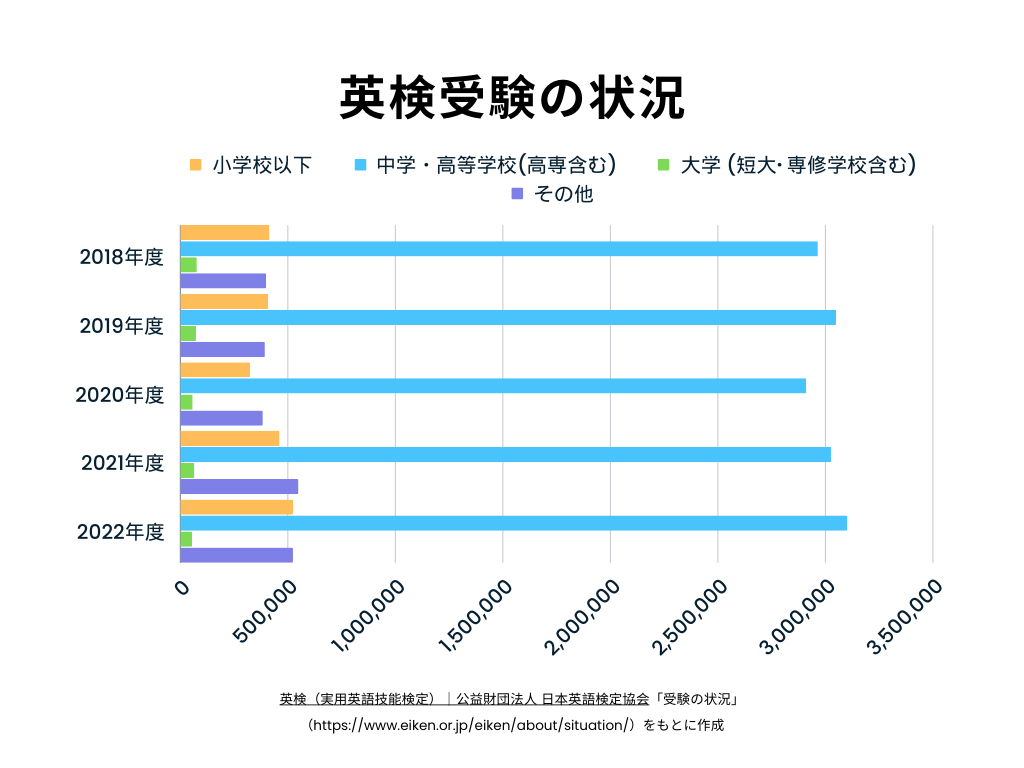 一方で、共通テスト対策だけでなく、各種英語試験の対策をしたいというご要望や、早いうちから英語を身につけておきたいという中学生のご受講も多くございました。特に「英検」にいたっては受験者の大多数が中高生であり、大学受験時に利用できる大学が増加傾向にあることを理由に、ここ数年中高生の間で需要が高まりつつあります。この傾向を受け、ENGLISH COMPANY大学受験部では英検に特化した「英検対策コース」を新設することといたしました。