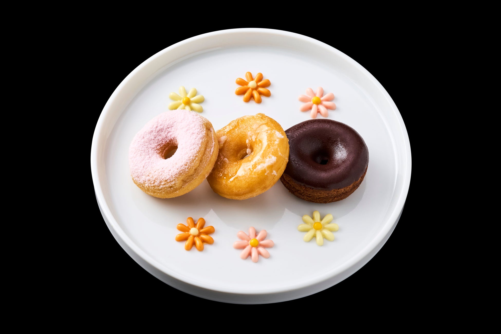 2006年の楽曲「スウィートドーナッツ」 のMVをモチーフに、お花のチョコレート&メレンゲをちりばめた一皿。ドーナツはいちご(粉糖)、シュガー、チョコの3つを楽しめる。