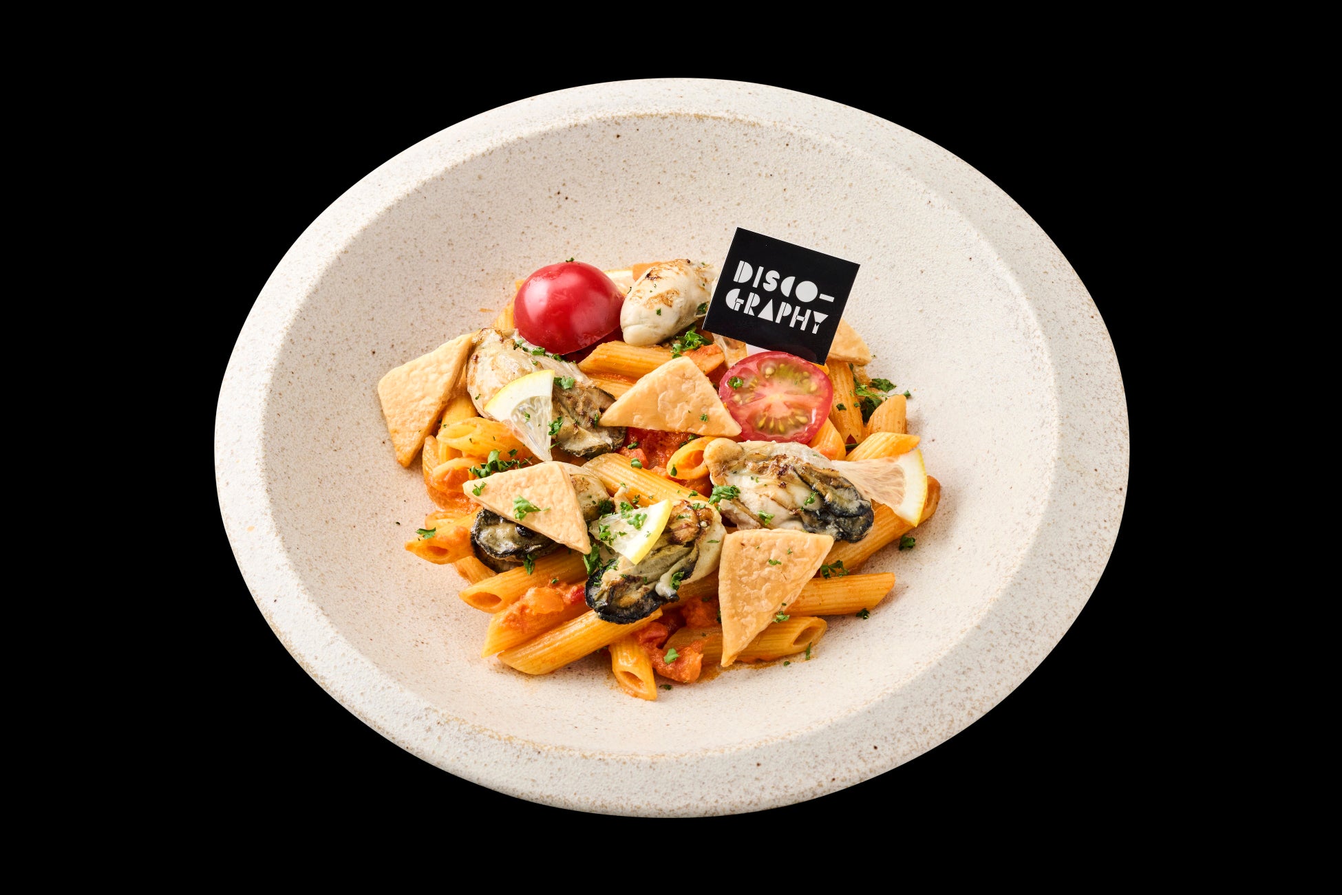 チョコレイト・ディスコ、ワンルーム・ディスコ 、すみっコディスコなど「ディスコ」シリーズの曲にちなみ、かつてディスコでよく食べられていた というぺンネ・アラ・ウォッカ、通称「ディスコパスタ」を現代風にリメイク。ショートパスタのペンネに、すこしぴりっと辛みのあるトマトクリームソースで味付け。Perfume出身地・広島を感じさせる、牡蠣とレモンも添えて。