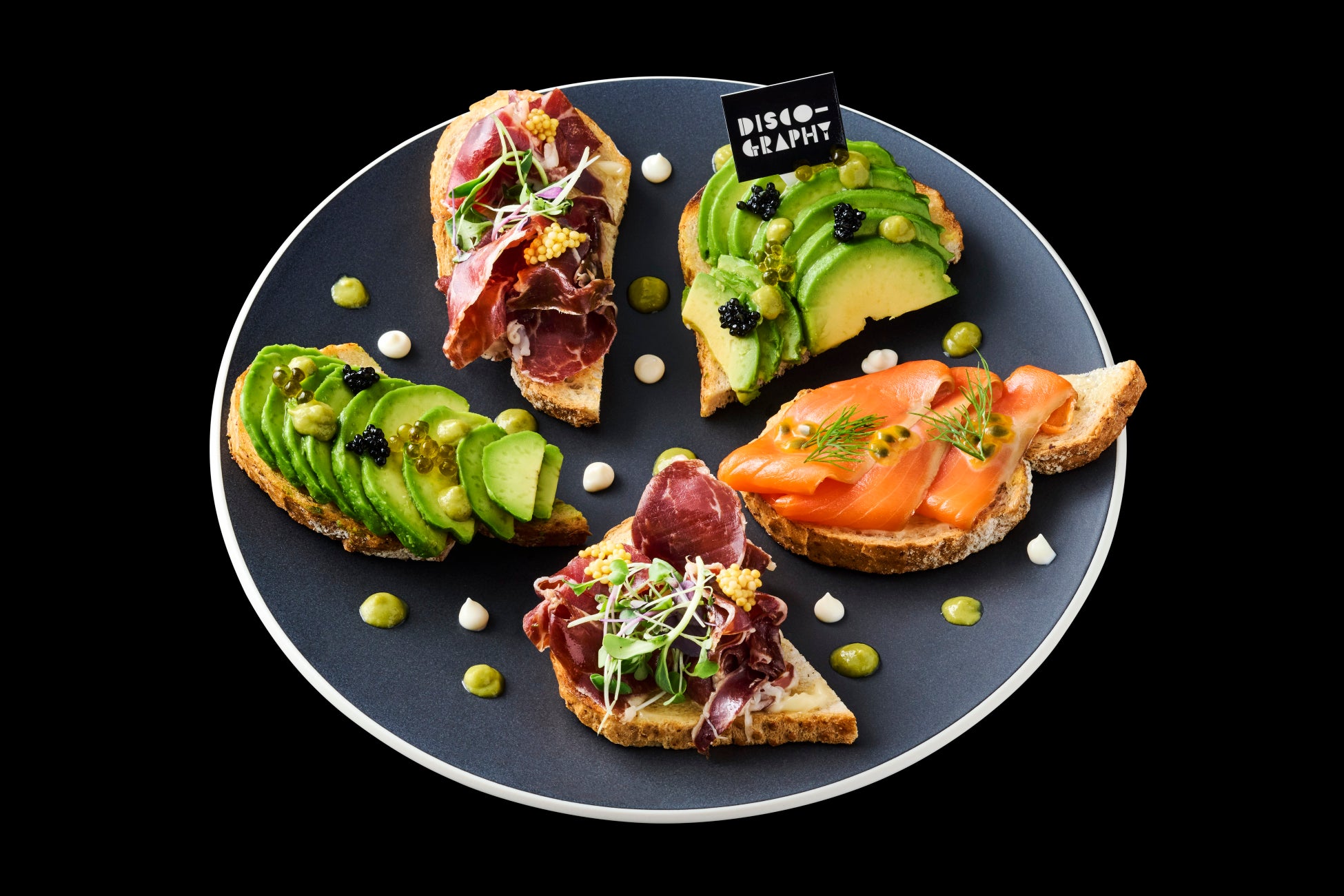 それぞれのメンバーをイメージした3種の味わいが楽しめるオープンサンド。結成25周年にちなみ、25種類の食材を使用。