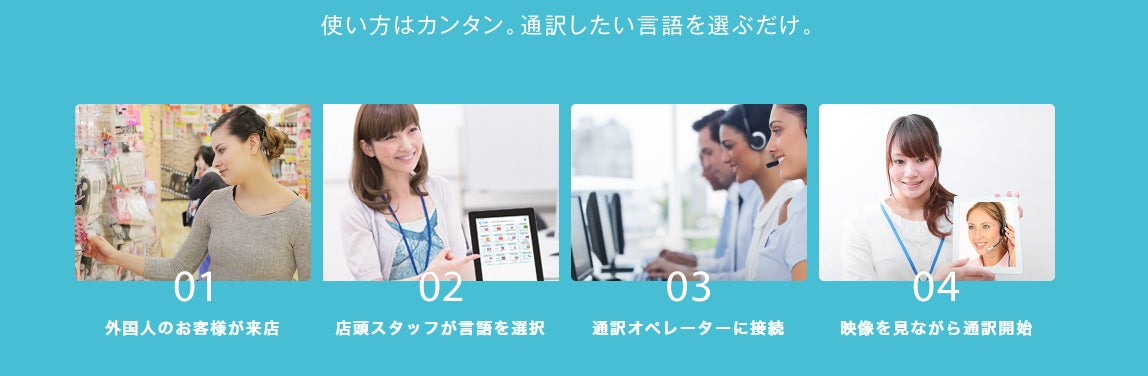 「みえる通訳」は、タブレットやスマートフォンからワンタッチで通訳オペレーターにつながり、お客様との接客をサポートする映像通訳サービスです。日本語と外国語が話せる専門の通訳オペレーターとFace to Faceでお互いの顔や表情が見えるため、微妙なニュアンスや機械では判別できない難しい内容でも会話することができます。