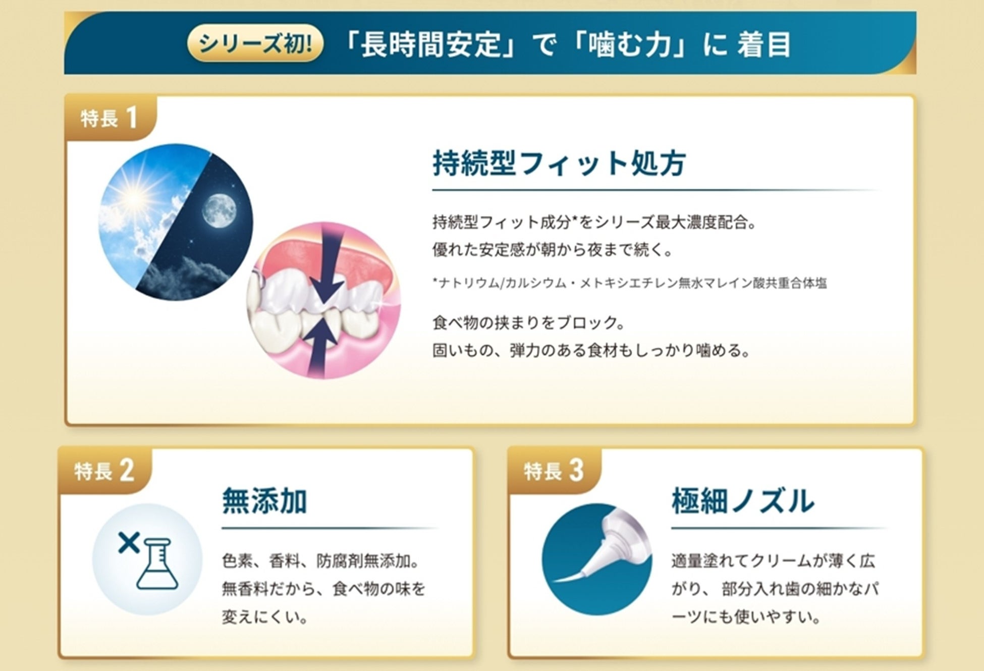 「本当は食べたいけれど、入れ歯だと怖くてつい避けてしまいがち」というお客様の悩みに耳を傾け、シリーズ初となる「持続型フィット処方」を開発しました。