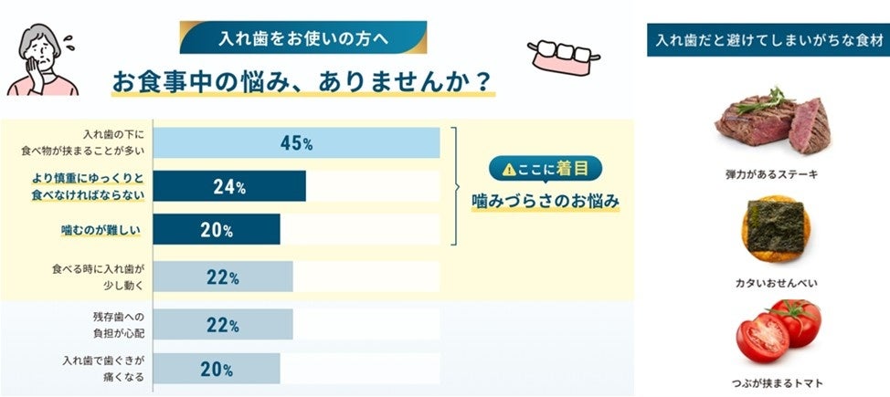 入れ歯をお使いの方を対象にしたアンケート調査(*3)によると、最も多い悩みは「入れ歯の下に食べ物が挟まることが多いこと」45%、次いで「より慎重にゆっくりと食べなければならない」24%、「噛むのが難しい」20%と、食事中の「噛みづらさ」に悩んでいる方が多いことが分かります。