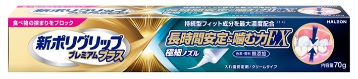 「新ポリグリップ プレミアムプラス 長時間安定&噛む力EX」は、食事中の「噛む力」に着目した、シリーズ最上位の入れ歯安定剤です。独自の「持続型フィット成分(*1)」をシリーズ最大濃度配合。優れた安定感が朝から晩まで一日中(*2)続きます。