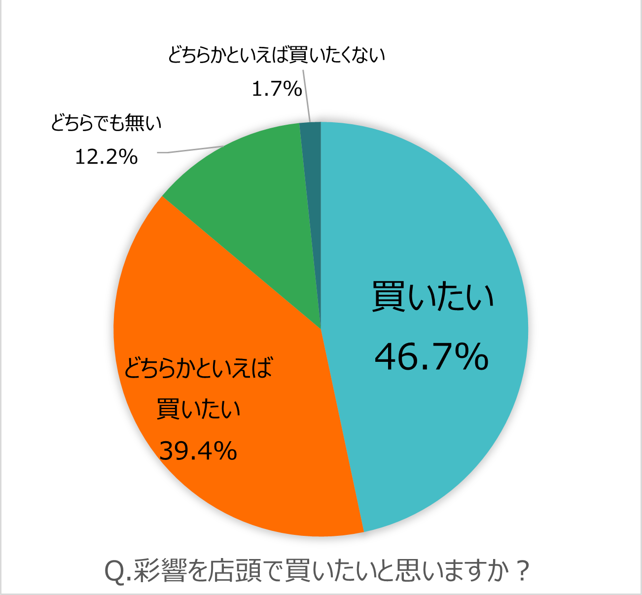 ポップアップイベント(東京会場)にて「彩響」を体験いただいたお客様にアンケートを実施したところ、「もう一度彩響を飲みたいと思いますか?」という質問に対し、約97%の方が「飲みたい※」と回答するなど、非常に高い評価をいただきました。(※「飲みたい」「どちらかといえば飲みたい」の合計)