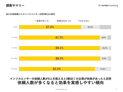 - 「案件を依頼したインフルエンサーが6人以上の企業」の8割以上が、インフルエンサーのPR活用効果を実感!