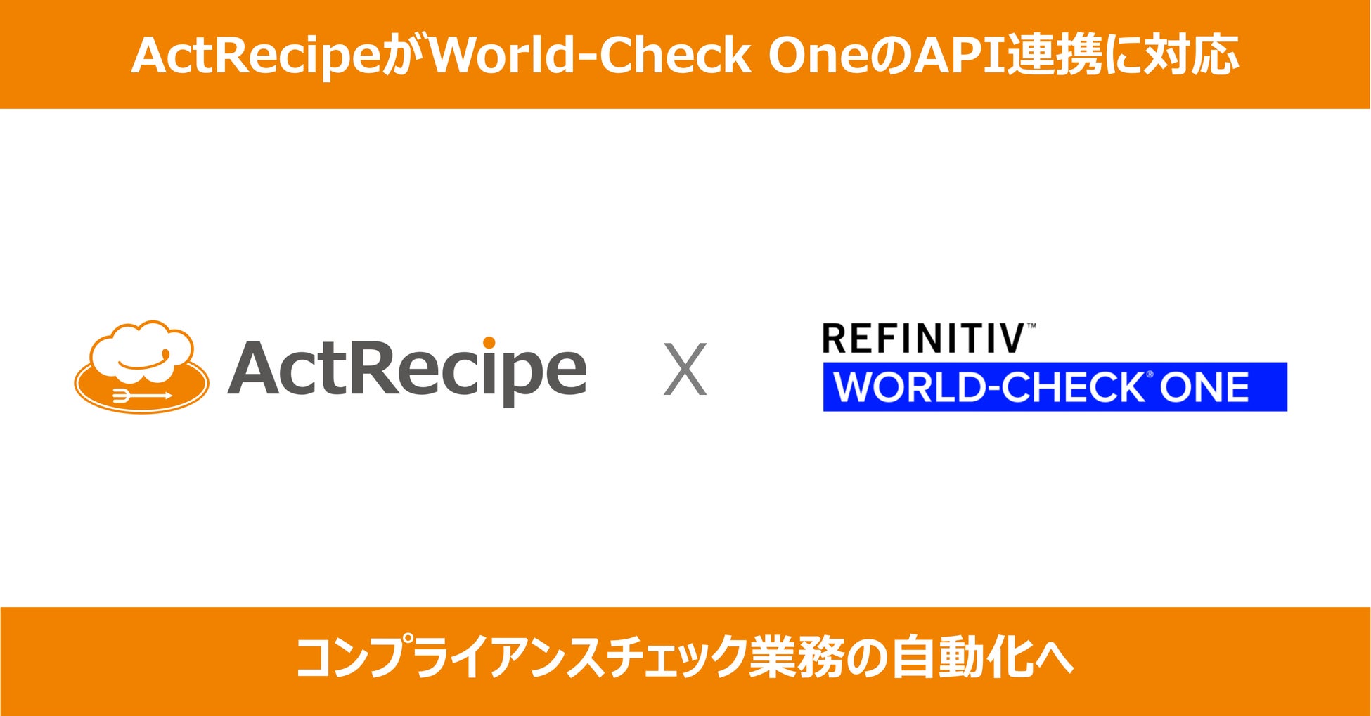 アクトレシピ、iPaaS「ActRecipe」にてコンプライアンスチェック・反社チェックの「World-Check One」とAPI連携を開始