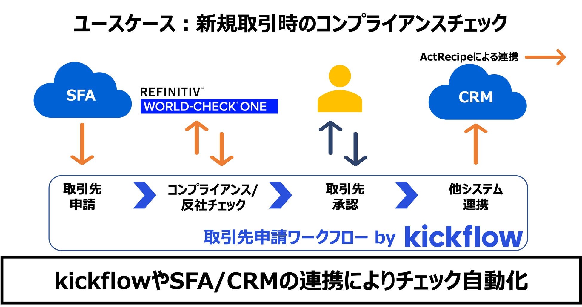 ActRecipeは、これまでに国内外の各種SaaS(Software as a Service)やFinTechの連携によって、企業様のバックオフィス業務の自動化・効率化を中心にご支援してまいりました。数あるバックオフィス業務の中でも内部統制の観点からニーズの多かったコンプライアンスチェック・反社チェック業務の自動化を模索し、国内外での豊富な利用実績がありAPIによる外部サービス連携が可能な「World-Check One」とのAPI連携を進めてまいりました。「World-Check One」とあらゆるSaaSの連携により以下のような業務の自動化にお役立ていただけます。