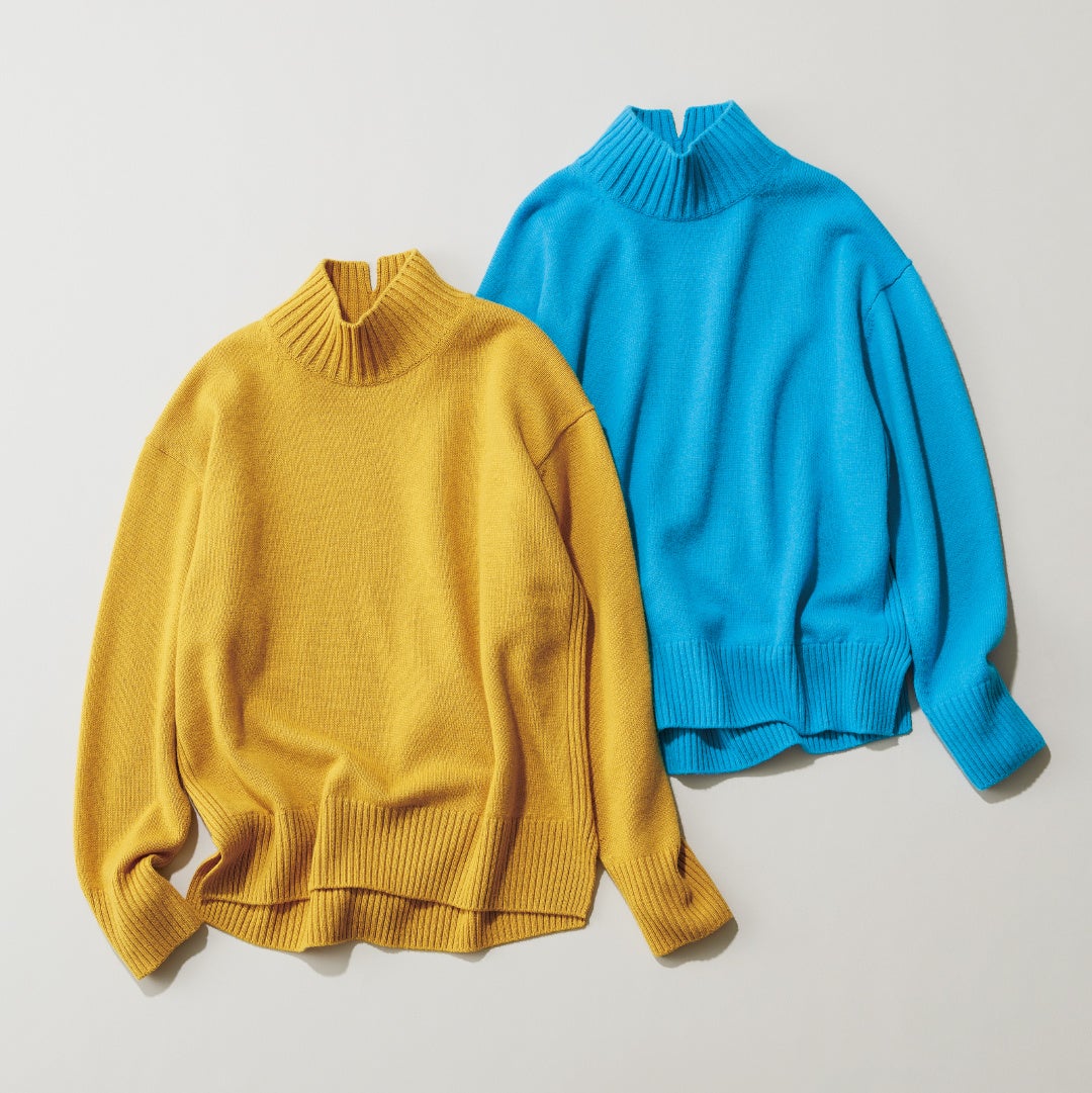 ニットというお話を頂いたときに「何かカラフルなものがいいです」とご提案させていただいて。色の見本を見せていただいたり、実際の大きさで作っていただいたりして何色か比べてみる中で、静と動、両方いけるカラフルさというか、大人っぽくシックにもできるし、活発に明るく着こなすこともできる2色です。黄色はピカピカではなくて、少し落ち着いているけれども、暗すぎない色。ブルーの方は、目が覚めるようなハッとした色合いでもあれば、少し落ち着いている、二つのニュアンスが組み合わさった、2色それぞれの魅力があるかなと感じています。デニムだったり、パンツスタイルでサラッと着ることもできるし、スカートに合わせたりとか、ボトムスはワイドでもタイトでも、両方素敵かなと思います。