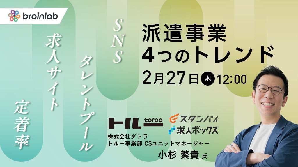 採用マーケティングATS「トルー」を運営する株式会社ダトラ(本社:大阪市中央区、代表取締役:草深悠介)は、株式会社ブレイン・ラボとの共催で、2025年2月27日(木)、「人材派遣会社様に知ってほしい!派遣事業拡大のトレンドはクワトロ(4つの)施策! 求人検索サイト × LINE × タレントプール × 派遣定着率の改善」をテーマに、無料オンラインセミナーを開催いたします 。