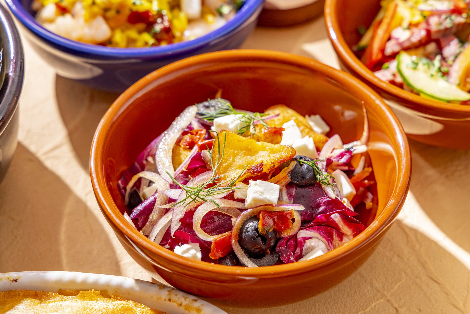 ギリシャの定番「グリークサラダ」、「フェタチーズとメロンのサラダ コリアンダー風味」、「地中海ライスサラダ」などを日替わりで3種類。