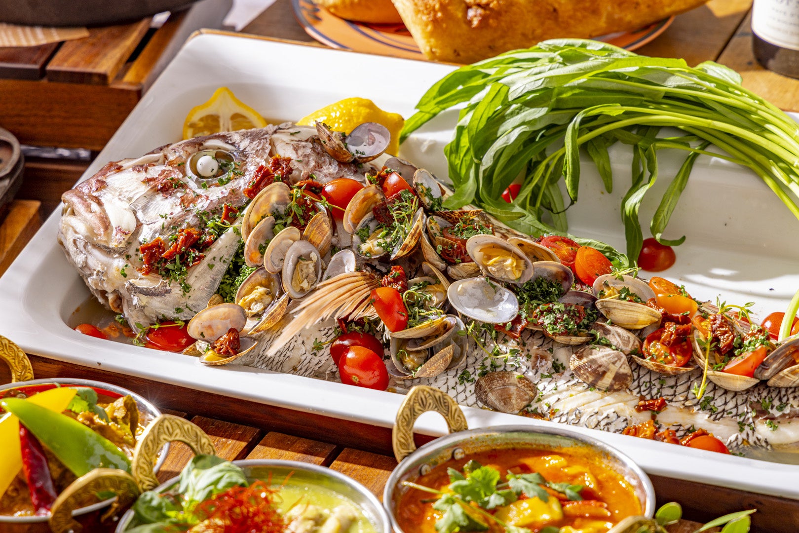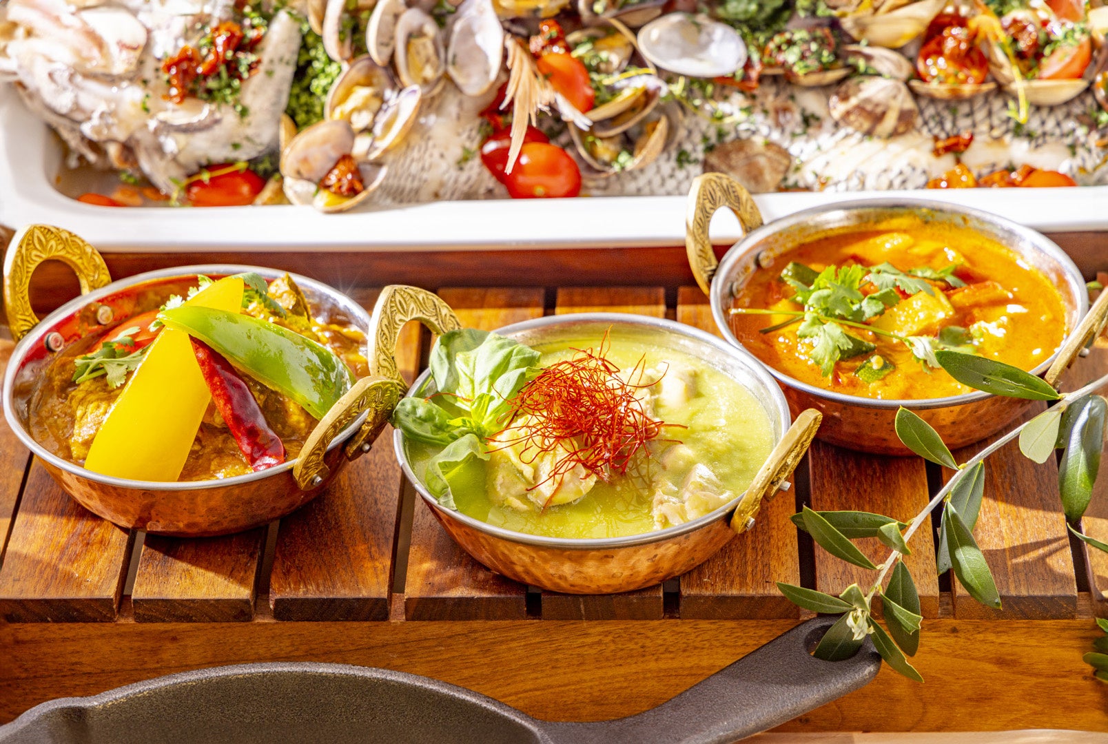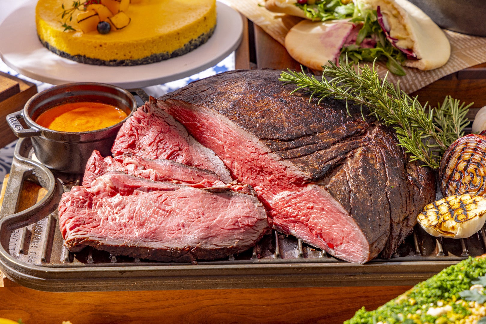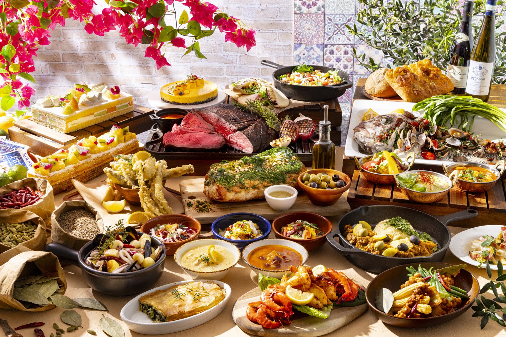 魚介出汁の旨みを堪能できる「アクアパッツア」、身がやわらかな稚鮎と夏に旬を迎える穴子を使った「稚鮎と穴子のフリットミストディマーレ」、エビの旨みをシンプルに味わえる「ガーリックシュリンプ」(土日祝限定メニュー)などの魚介料理をはじめ、厳選した豚ロース肉をナッツとハーブでコーティングして豪快に焼き上げた「ローストポーク ナッツクラスト焼き アンチョビソース」や、オリーブと塩漬けレモンが効いた「チキンのタジン風 オリーブと塩漬けレモン」などの地中海の恵みがビュッフェステーションを華やかに彩ります。 シーズンごとにテーマに合わせてアレンジするローストビーフはカルダモンやシナモン、タイムなどでマリネして焼き上げ、北アフリカ発祥と言われる唐辛子をベースにした調味料「ハリッサ」を使用したパプリカソースで地中海風に仕上げました。スパイスやハーブの鮮烈な香りと旨味が広がる選りすぐりの料理を心ゆくまでご堪能ください。