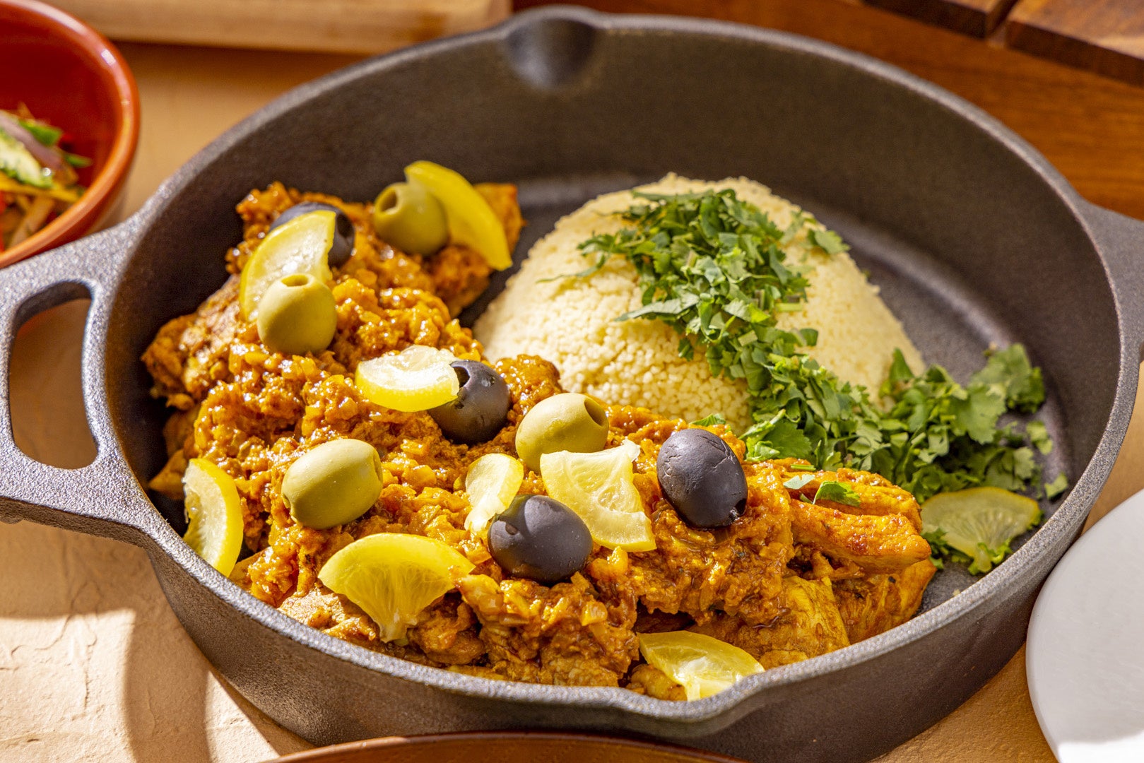 ターメリックやシナモンなどのスパイスを効かせたチキンにクスクス合わせ、オリーブと塩漬けレモンで味を引き締めました。